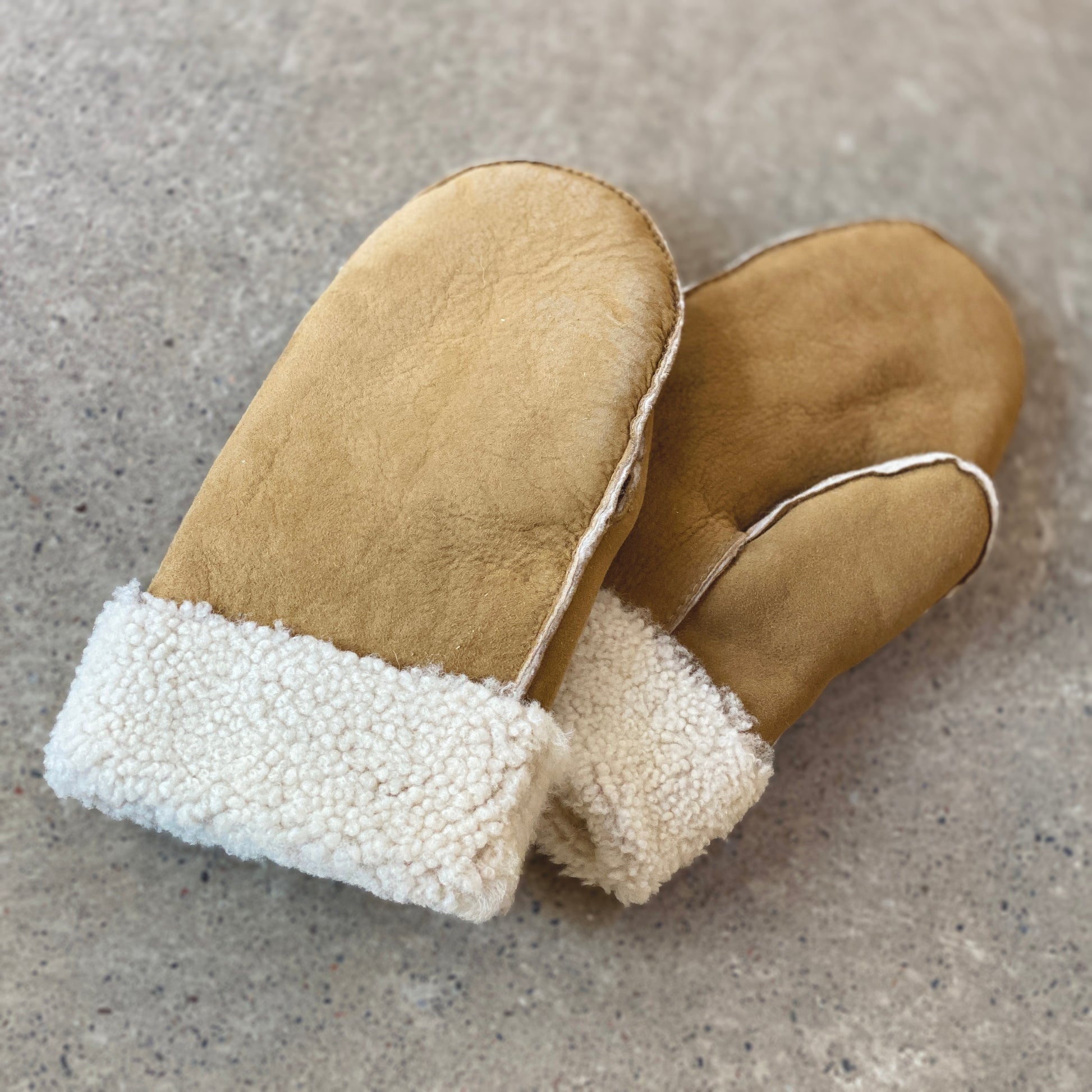 A pair of genuine sheepskin mittens with a fluffy cuff. These luxury mitts not only look good but will keep your hands nice and toasty in cold weather.