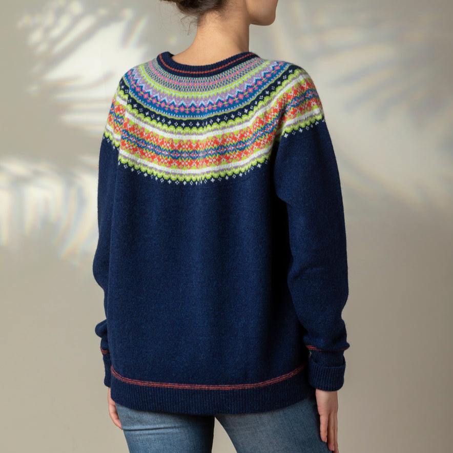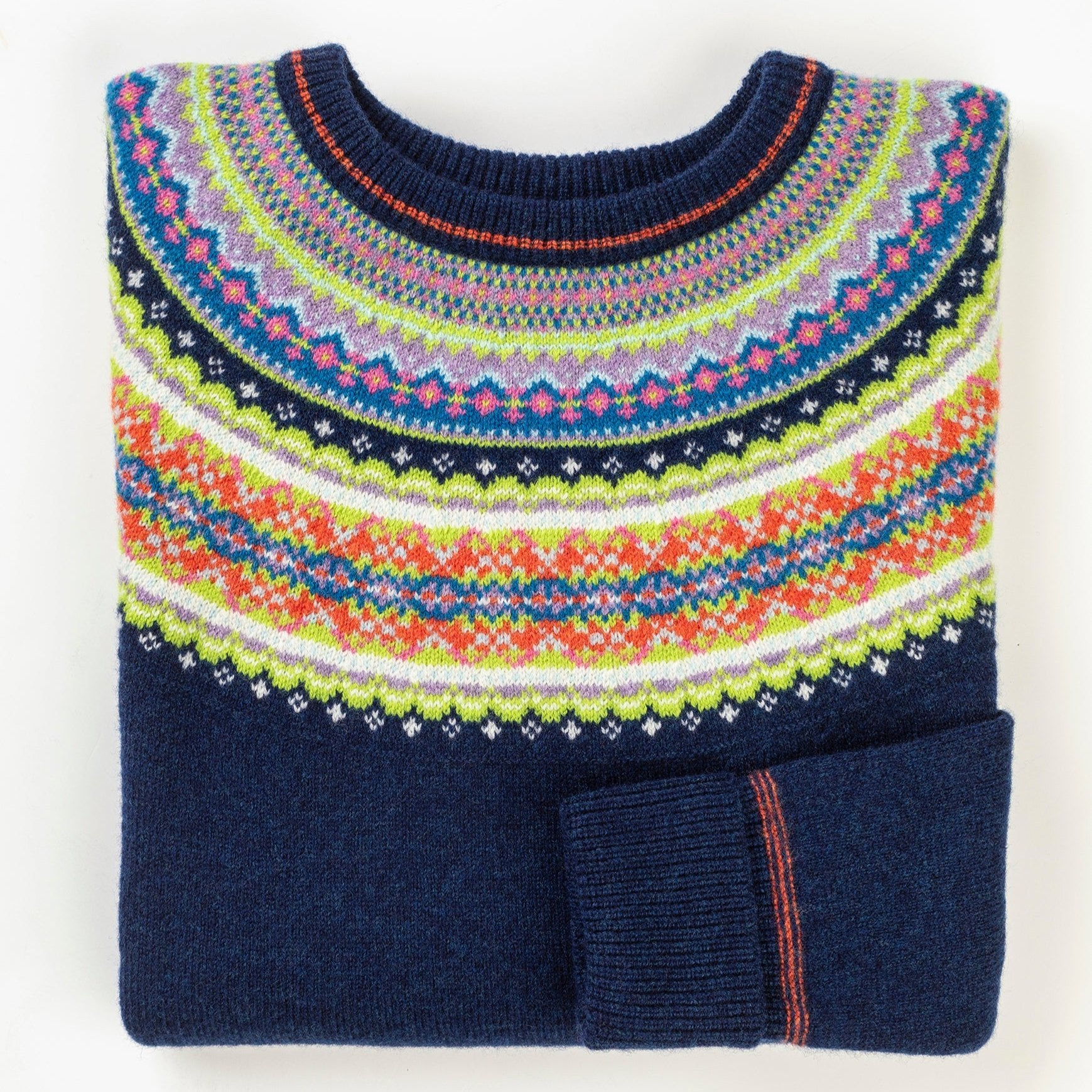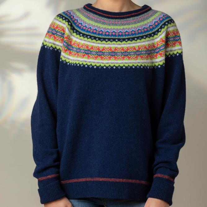 The breeze sweater features ribbed cuffs and Fairisle pattern only on the shoulder. Made from 100% Lambswool. Made in EU.