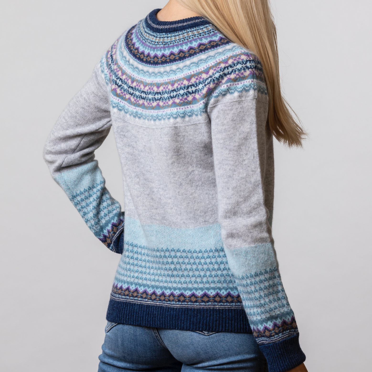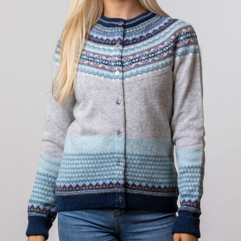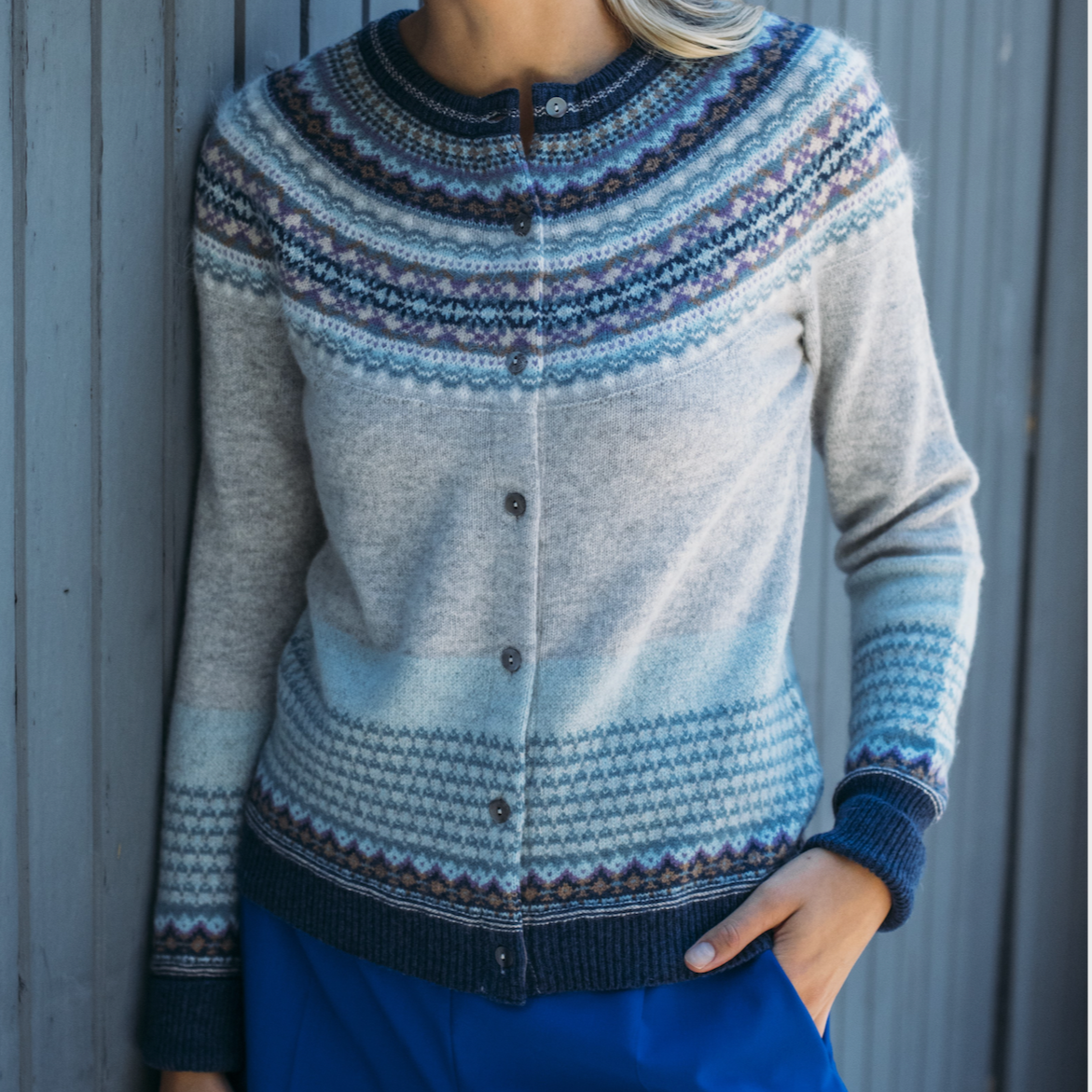 This lambswool cardigan features an 8 colour fairisle yoke with accents of luxe silky soft angora for texture, cosy long turn-down cuffs and mother of pearl buttons.