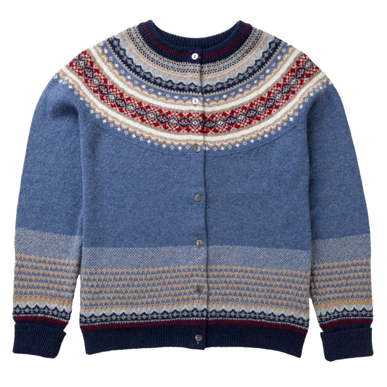 This lambswool cardigan features an 8 colour fairisle yoke with accents of luxe silky soft angora for texture, cosy long turn-down cuffs and mother of pearl buttons.