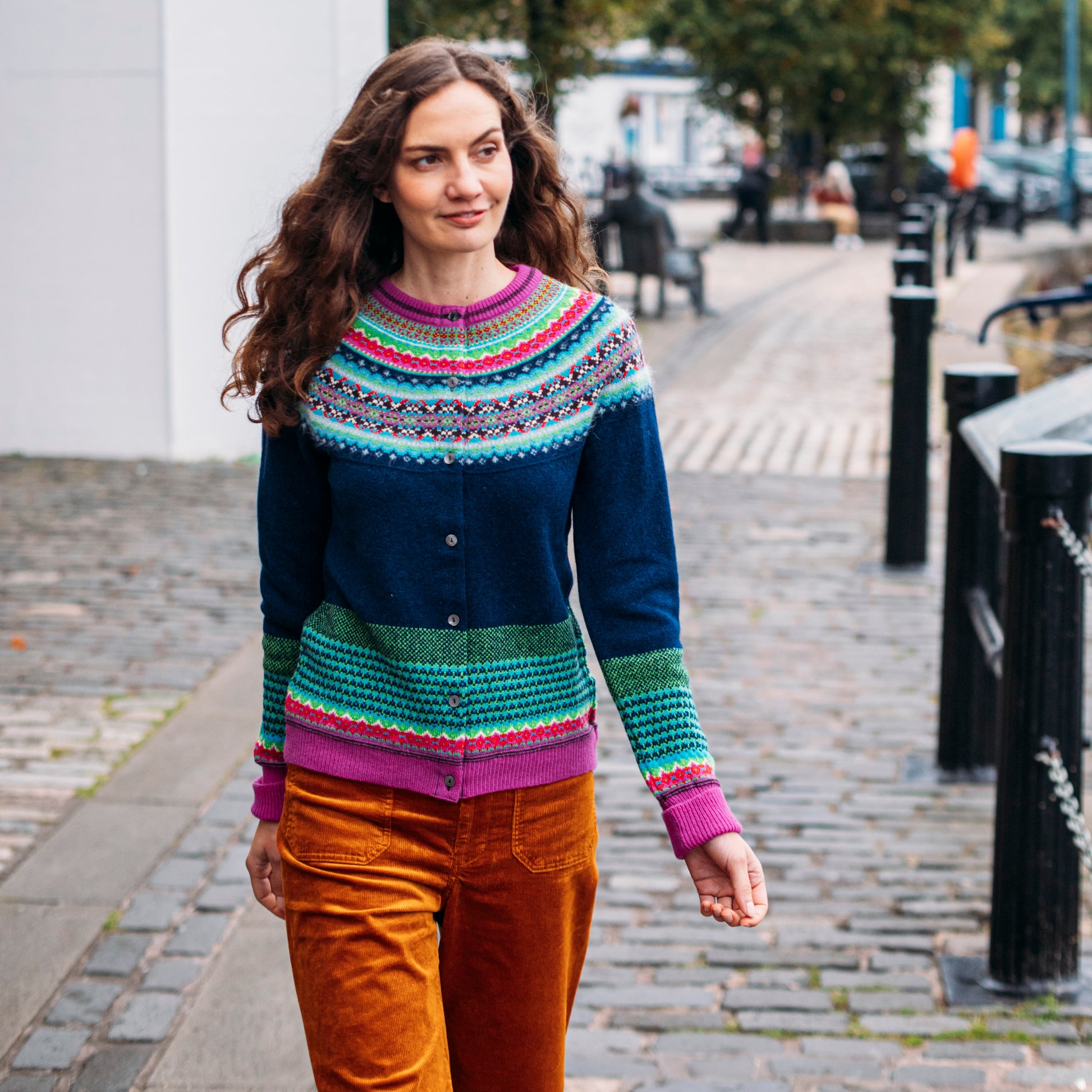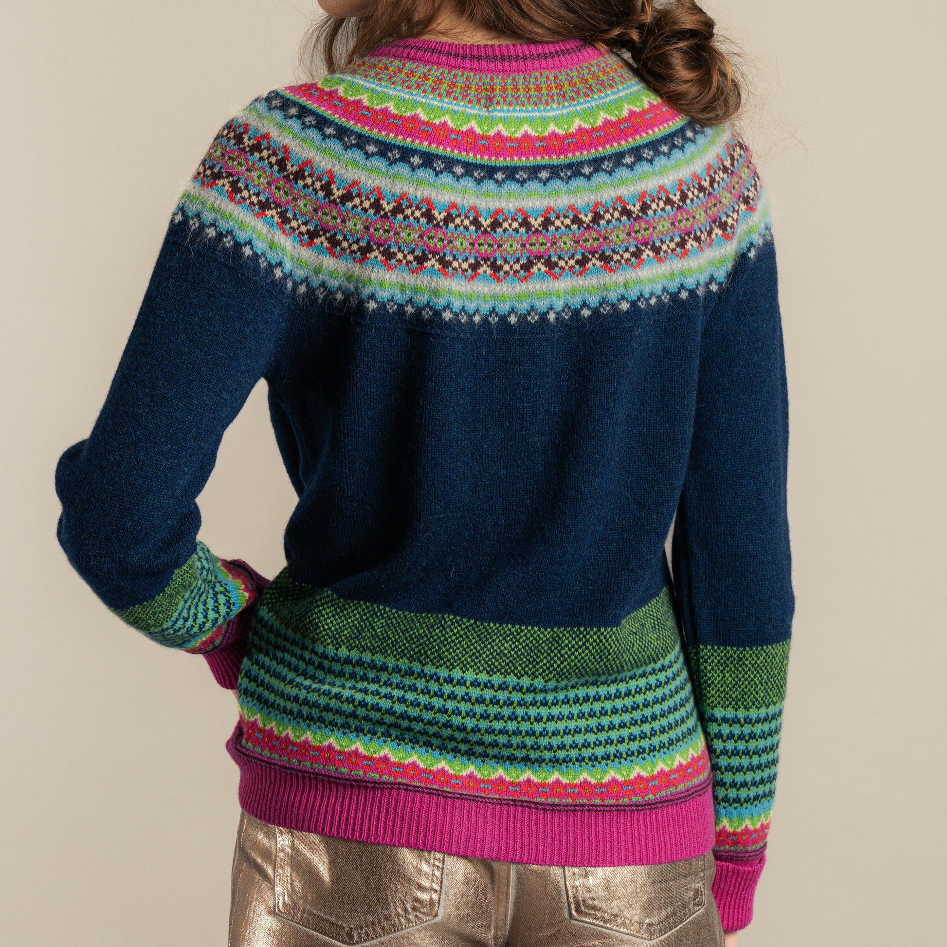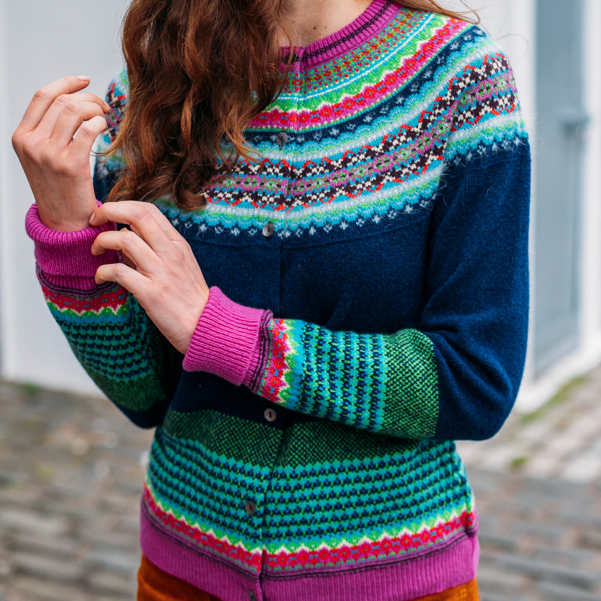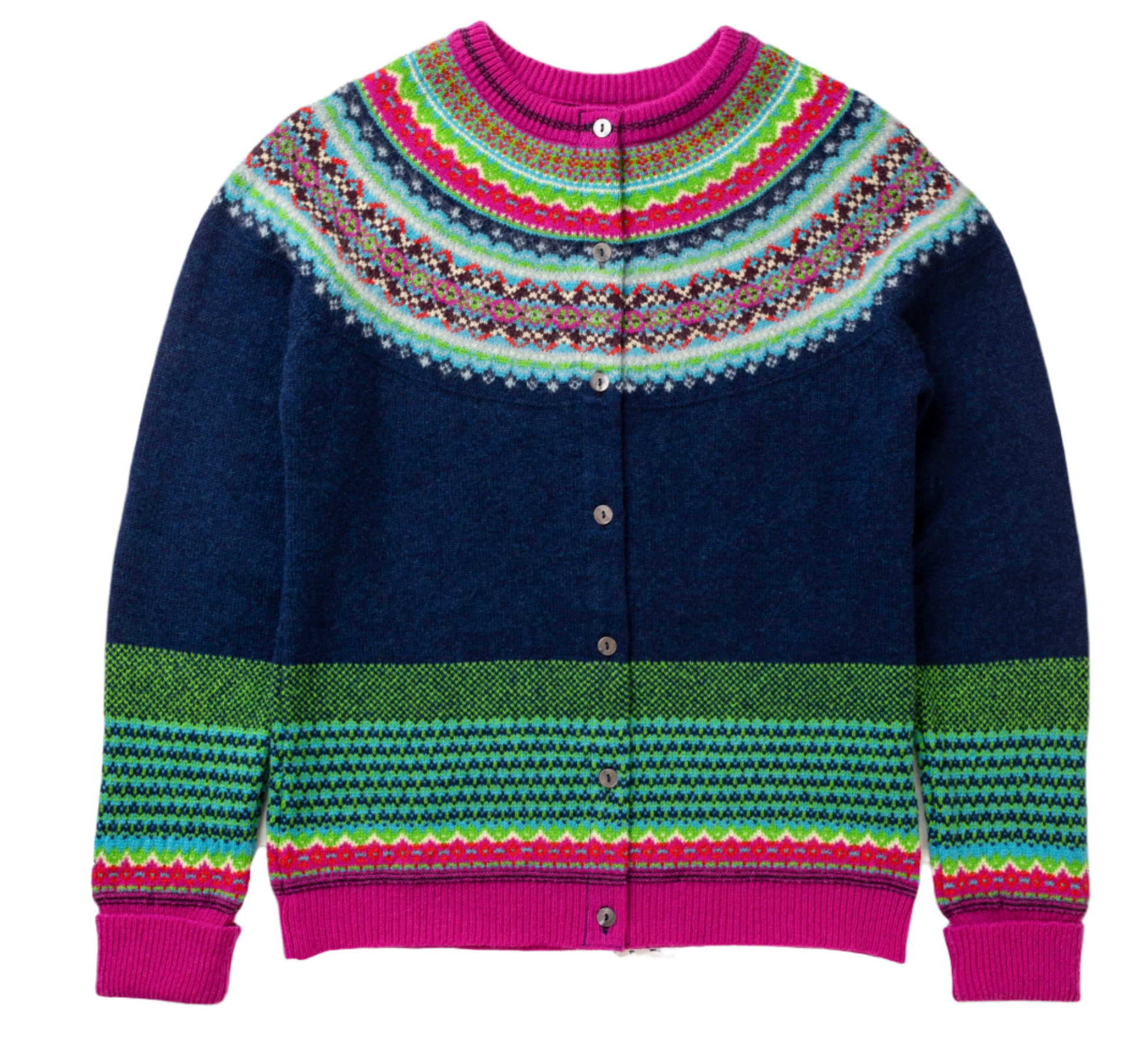 This lambswool cardigan features an 8 colour fairisle yoke with accents of luxe silky soft angora for texture, cosy long turn-down cuffs and mother of pearl buttons.