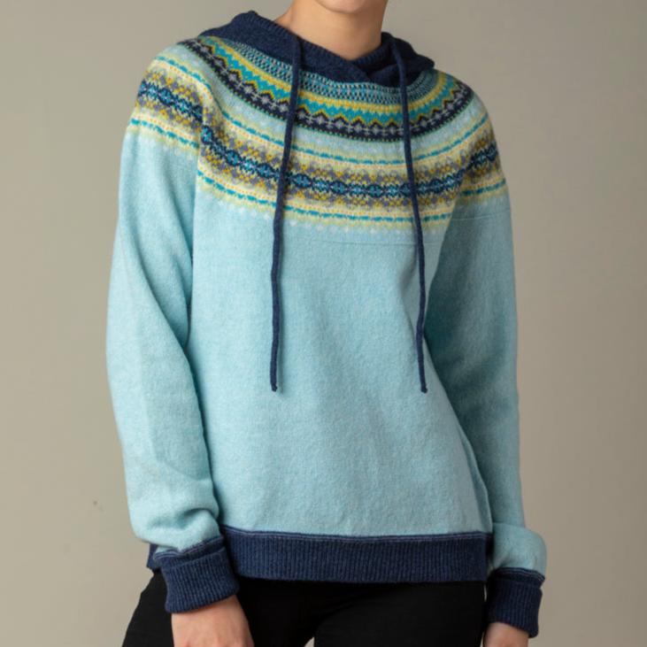 A sporty take on Eribe's classic Fairisle yoke Alpine. With a generous hood and cosy extra long cuffs to help keep your hands warm, finished with knitted ties.