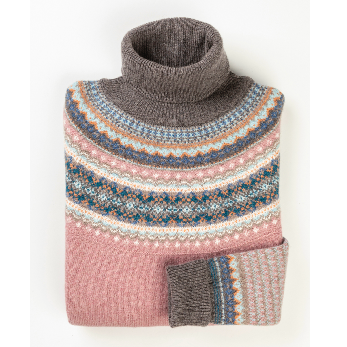 A regular fit roll neck sweater with a slightly shaped waist. Fairisle and tweed pattern