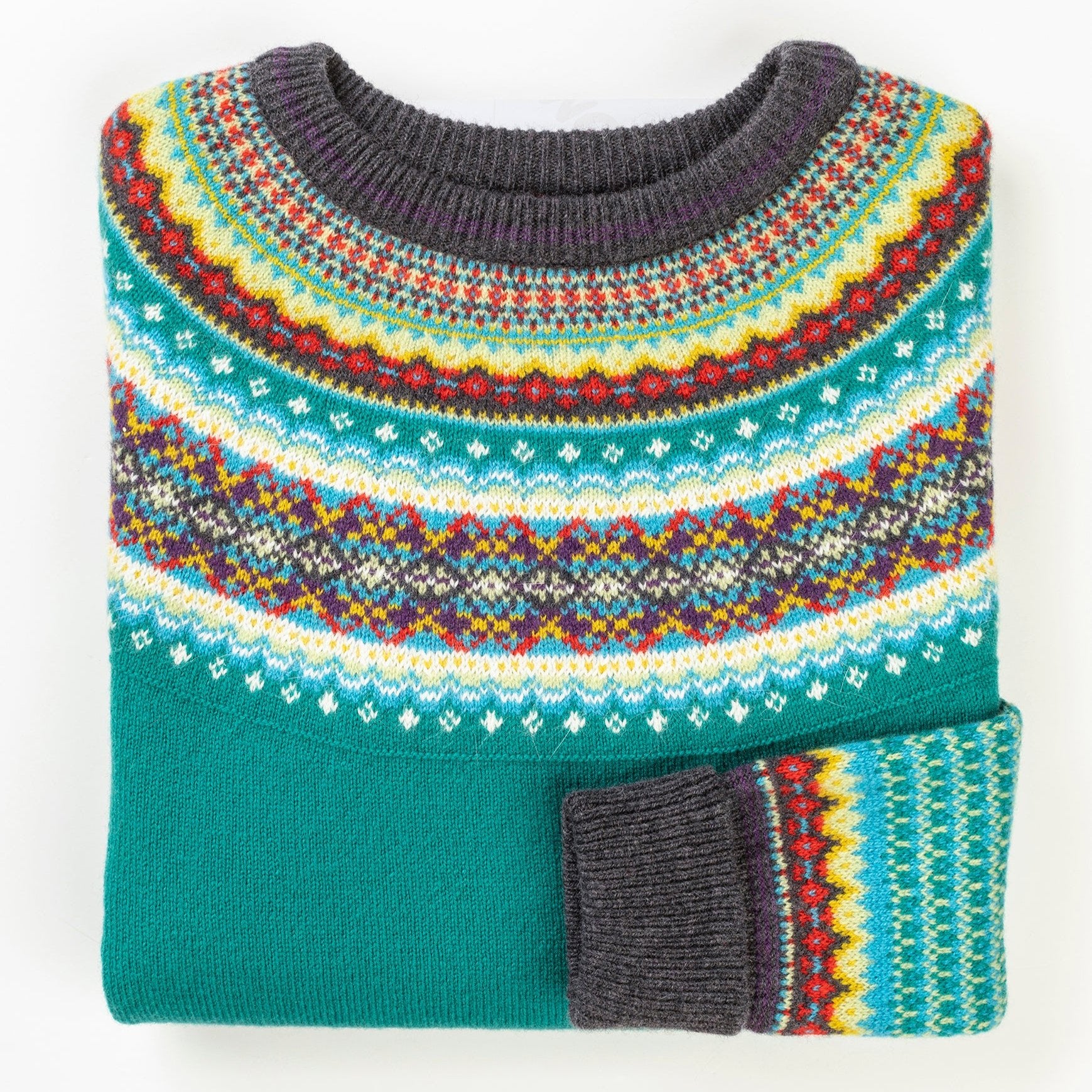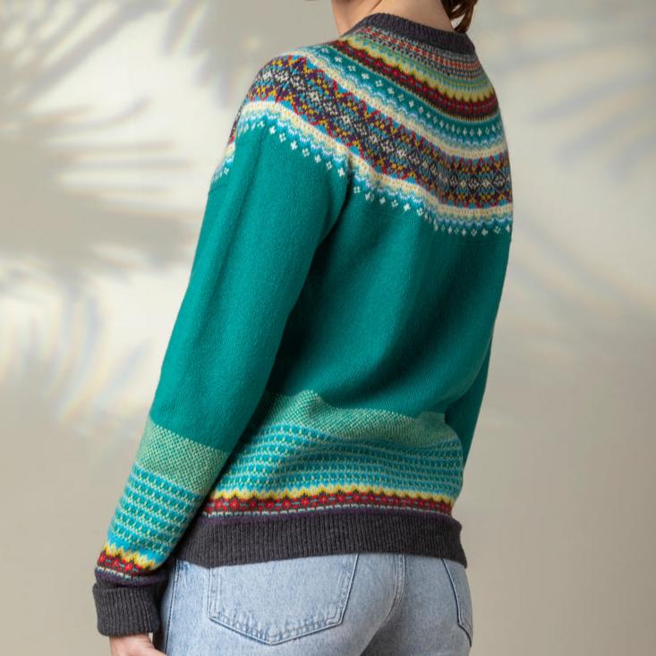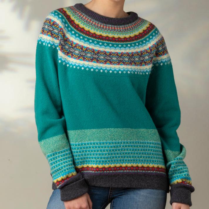 The ERIBÉ signature style and companion to the Alpine cardigan, this Fairisle pattern yoke Merino Wool sweater has a slightly shaped waist for a flattering fit and a touch of luxury angora in the yoke for added soft texture. Finished with cosy turn-down cuffs to keep your hands warm.