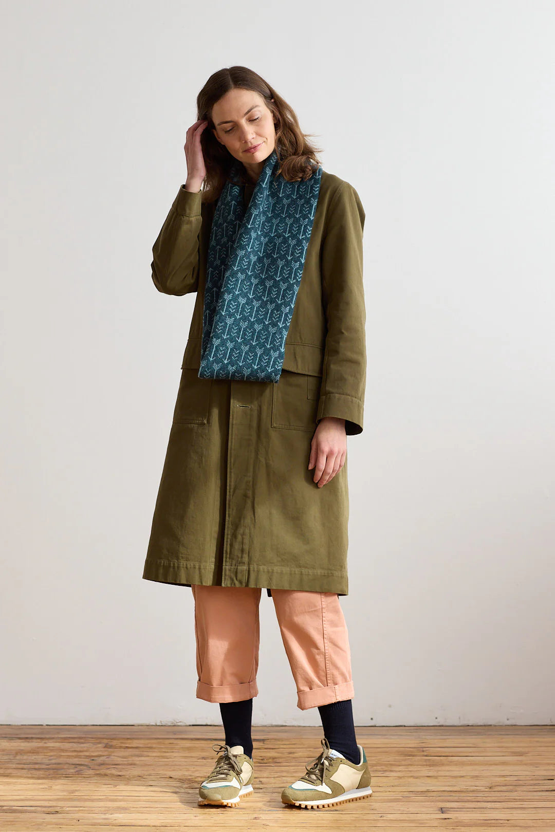 A classic circle scarf style. The construction of the pieces creates a lighter, more airy structure than a jacquard knit. Can be worn open, or twisted and doubled, for an extra snug fit.