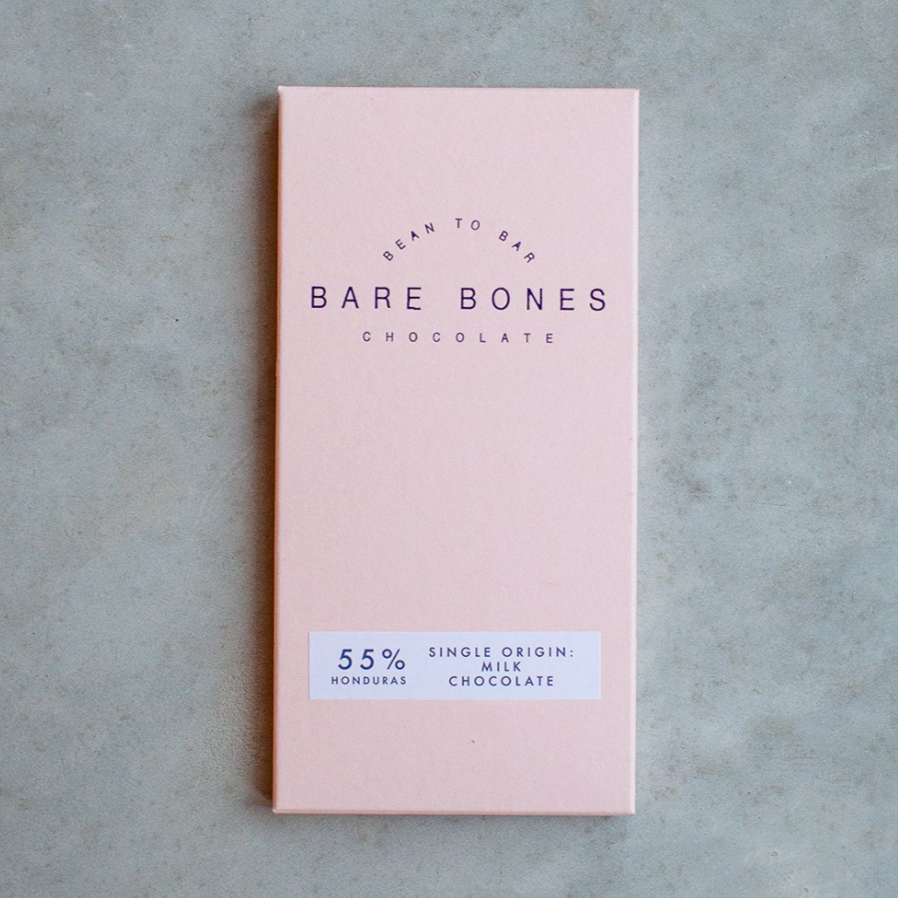 A 70g bar of Honduras 55% milk chocolate, with tasting notes of raisins, fudge & double cream, from single-origin chocolate makers Bare Bones.