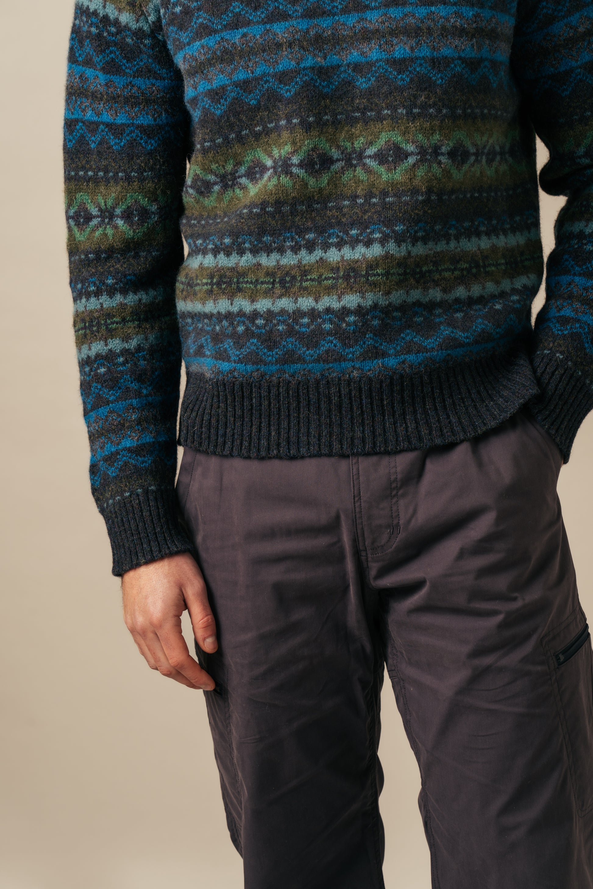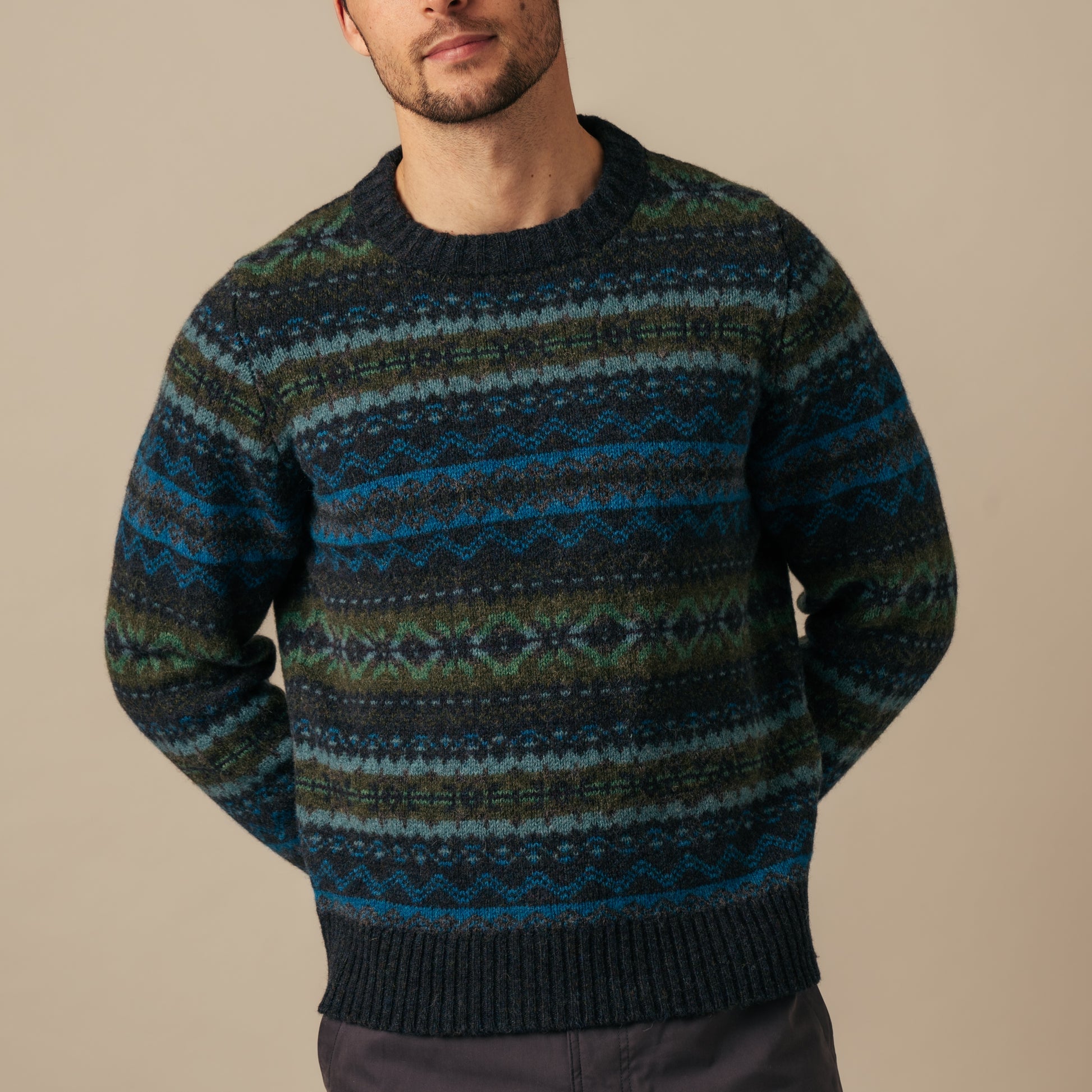 A mid-weight, round neck sweater with an all-over Fairisle pattern and a firm 2/2 rib hem and cuff.