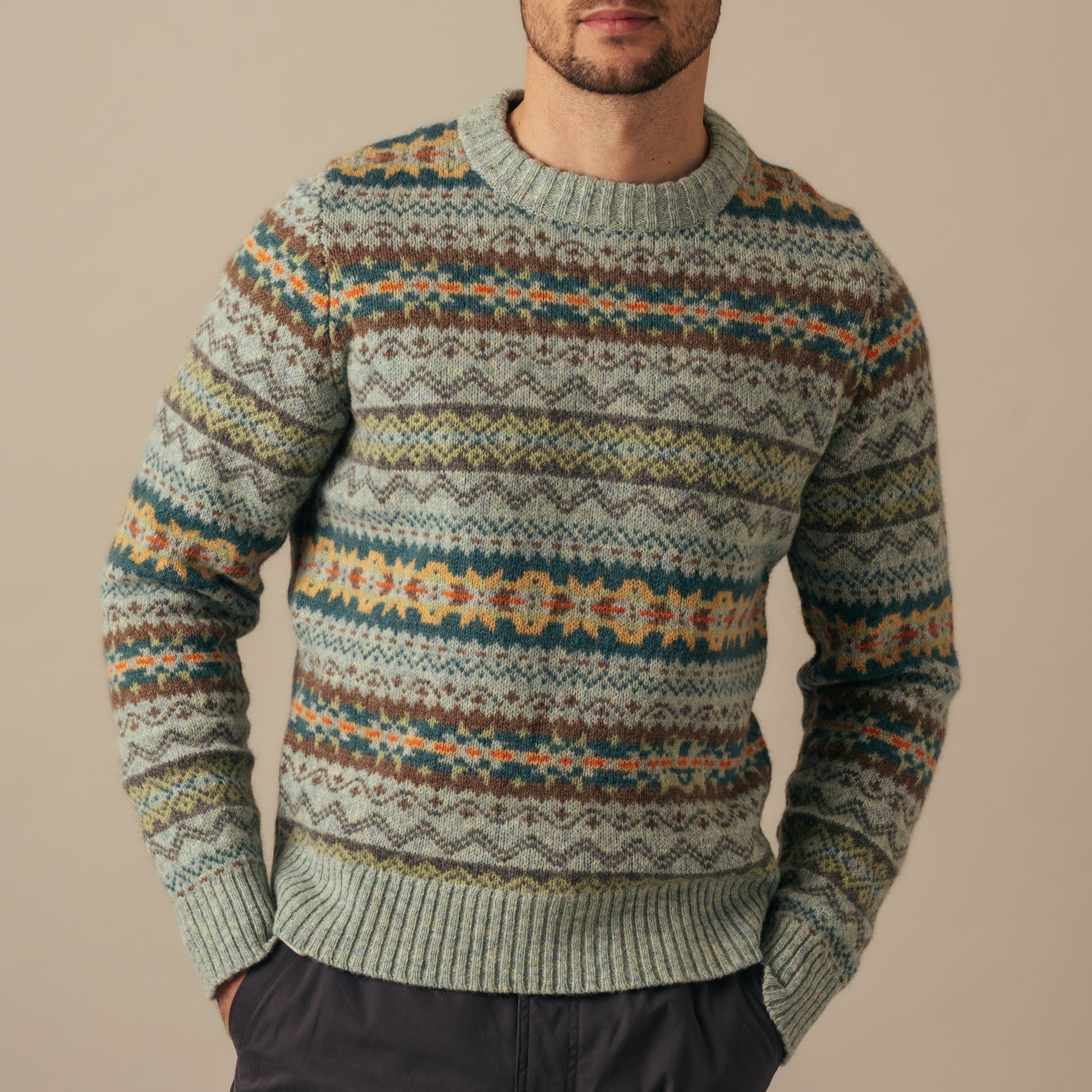 A mid-weight, round neck sweater with an all-over Fairisle pattern and a firm 2/2 rib hem and cuff.