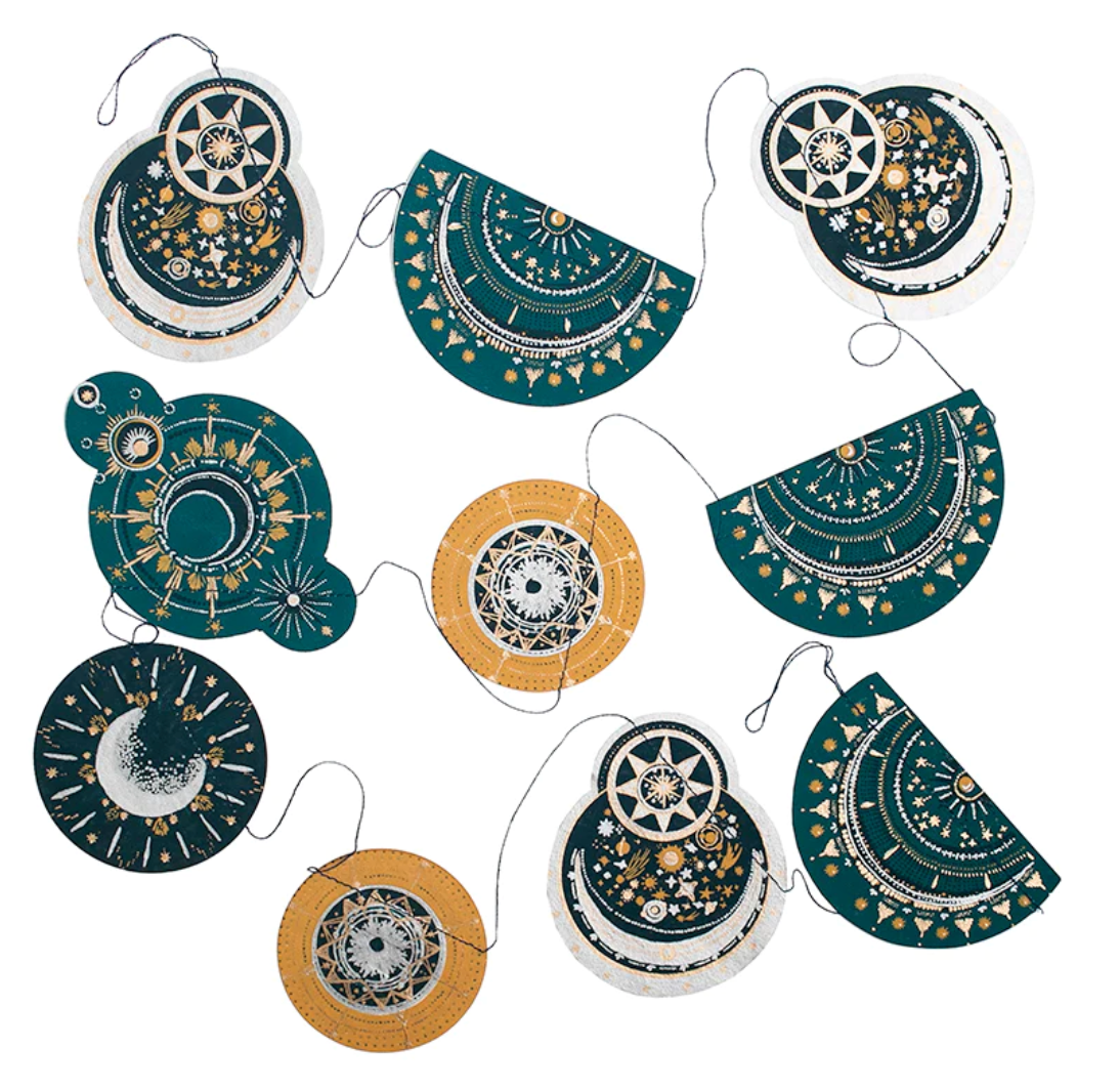 The winter night sky on a garland! Hand printed three metre long paper garland, featuring ten screen printed paper shapes of different moons, stars and suns in shades of teal, ochre, blue, copper and silver. The garland is 3 metres long and printed on both sides on thick, hand made cotton paper.