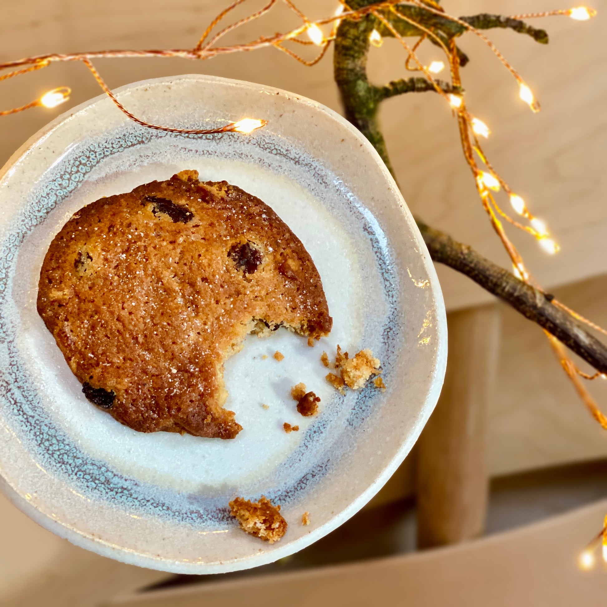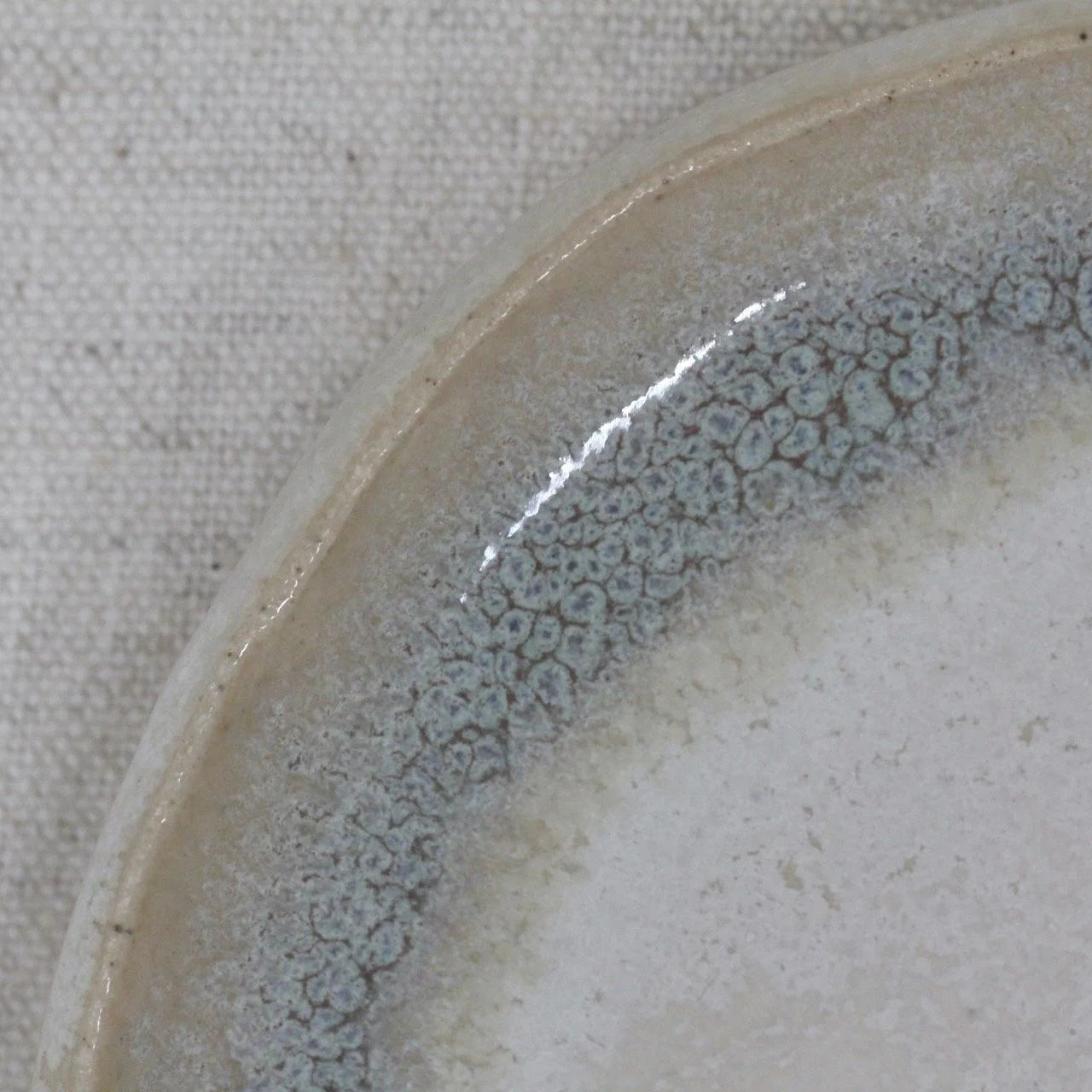 Small snack plate, slab built in a flecked stoneware clay body and white glaze with texture blue detail around the rim.