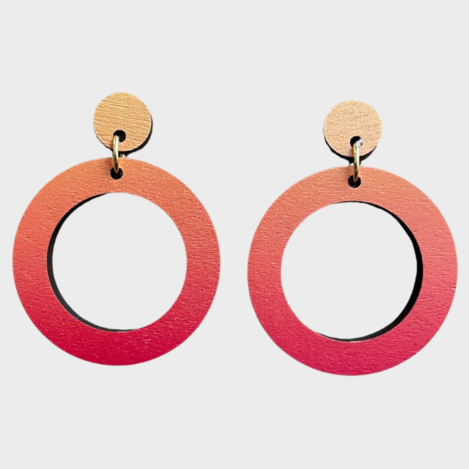 Circle drop earrings in an orange gradient, made from responsibly sourced maple veneer with hypoallergenic stainless steel ear posts.