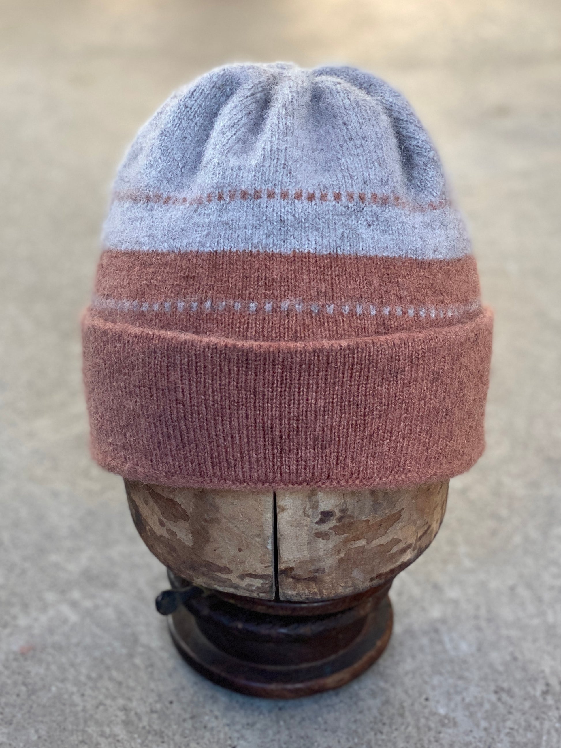 The hats are knitted then slightly felted to soften the knit whilst creating texture and strength. A double layered fold up hem then lends warmth where its most needed.