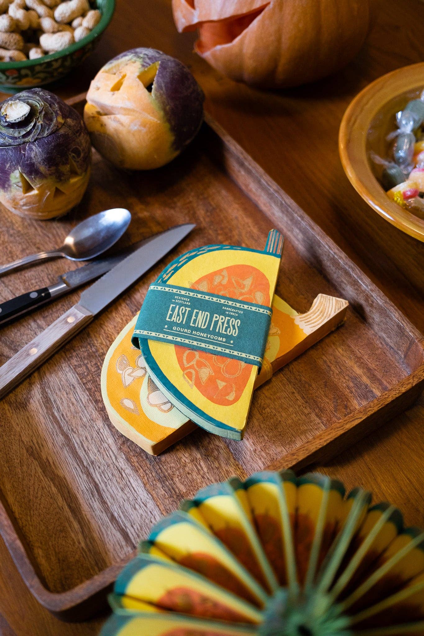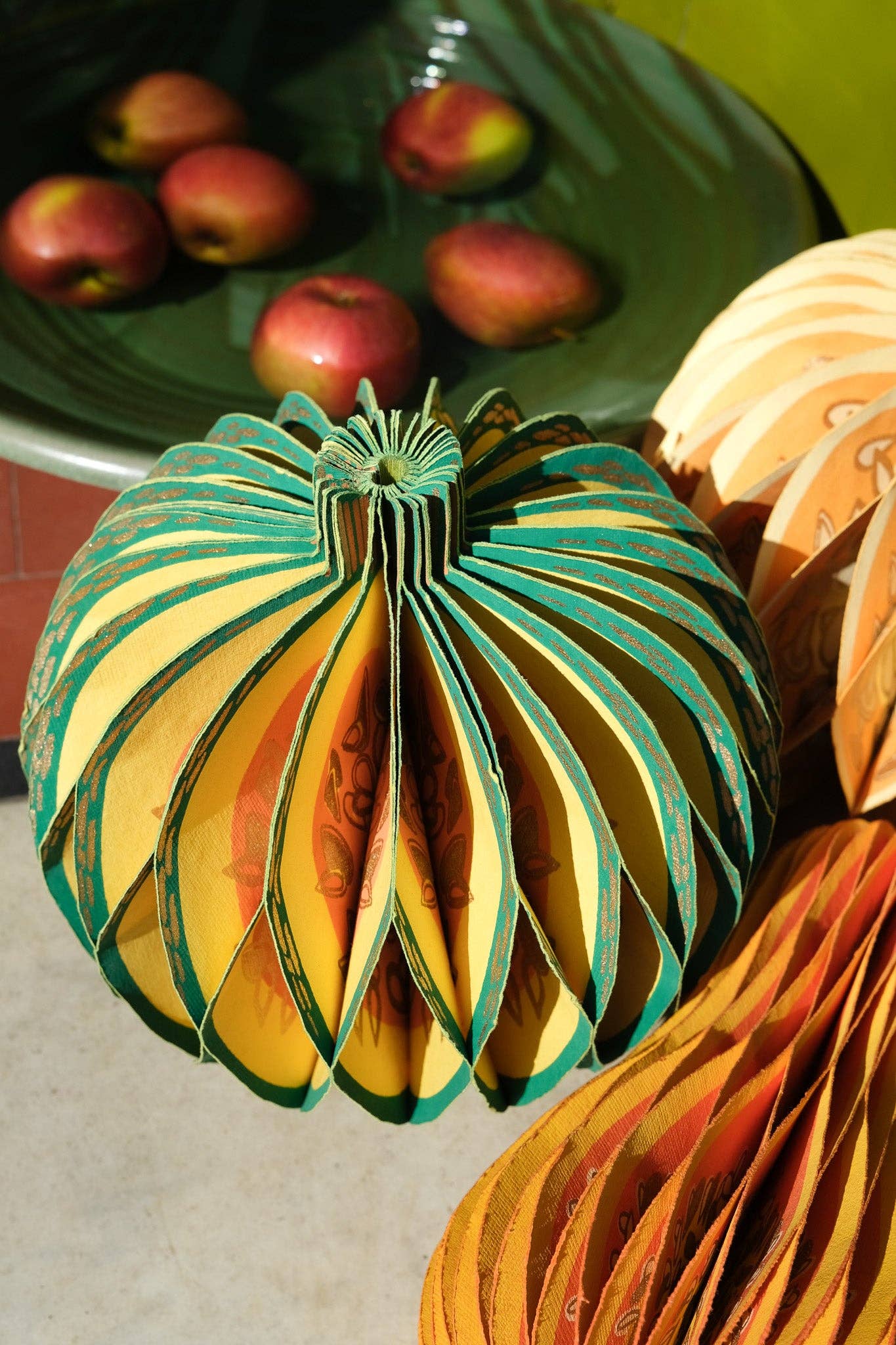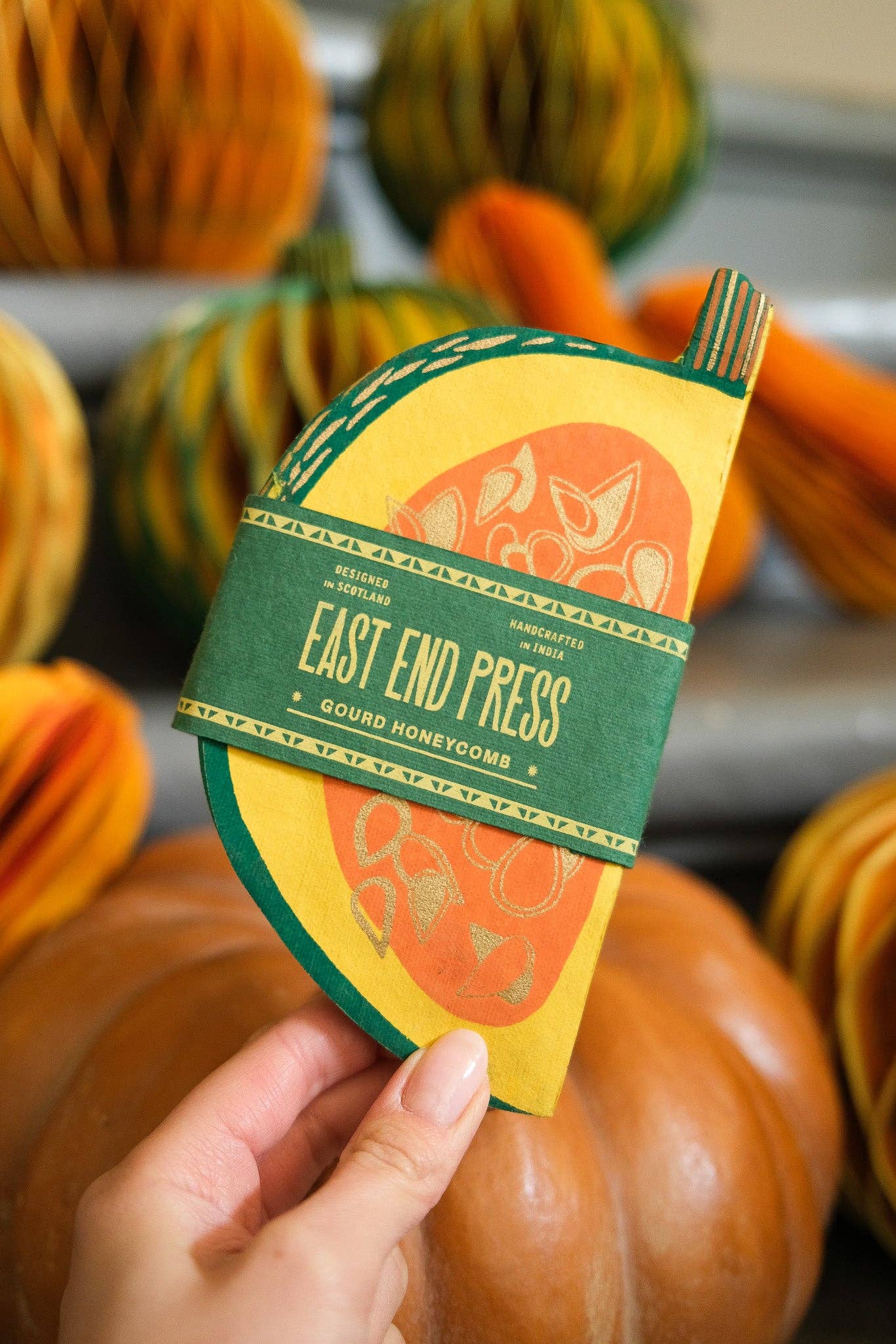 Composed of intricate layers of recycled cotton paper, each decoration unfolds and secured by a magnet to reveal a three-dimensional honeycomb gourd.