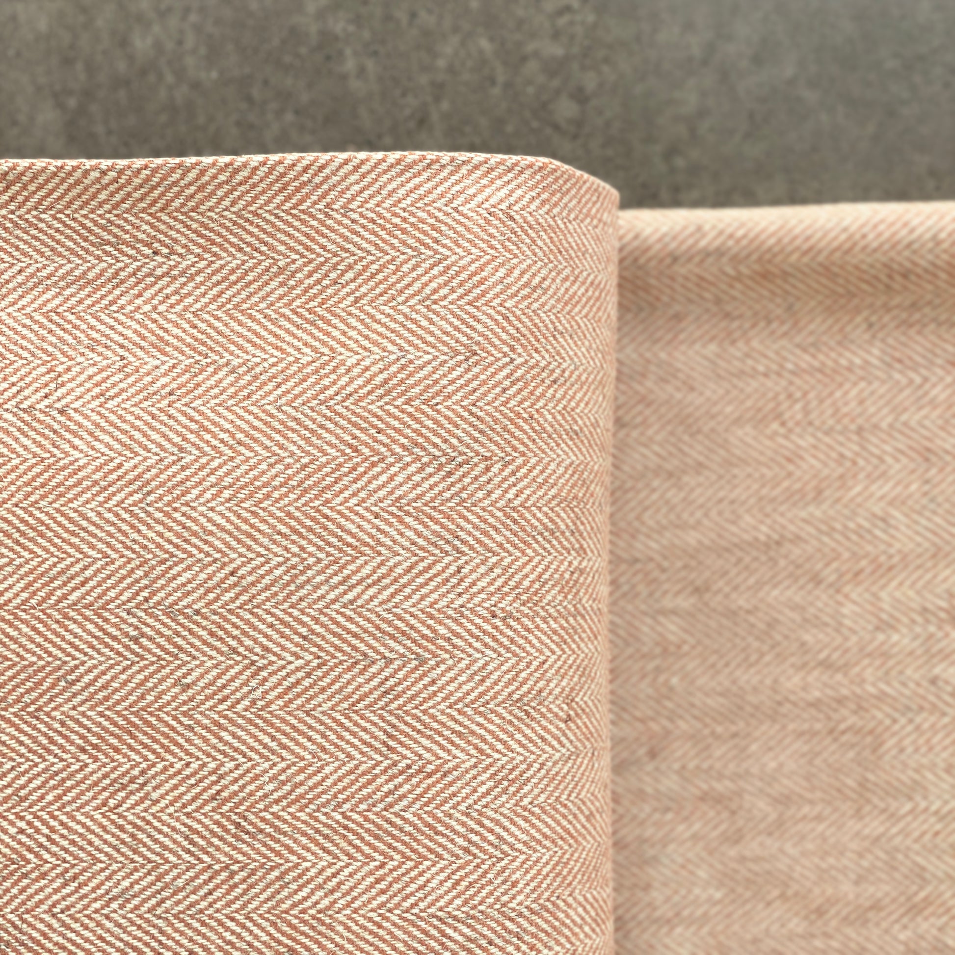 A timeless selvedge tweed woven in a herringbone pattern from 100% single origin yarn grown on the Isle of Iona, using silver in the warp and Fired Clay in the weft.