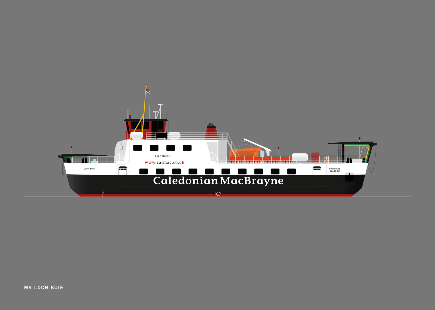 An A5 non-mounted illustration of the ‘MV Loch Buie’ which provides the lifeline connection between the island of Iona with the Ross of Mull.