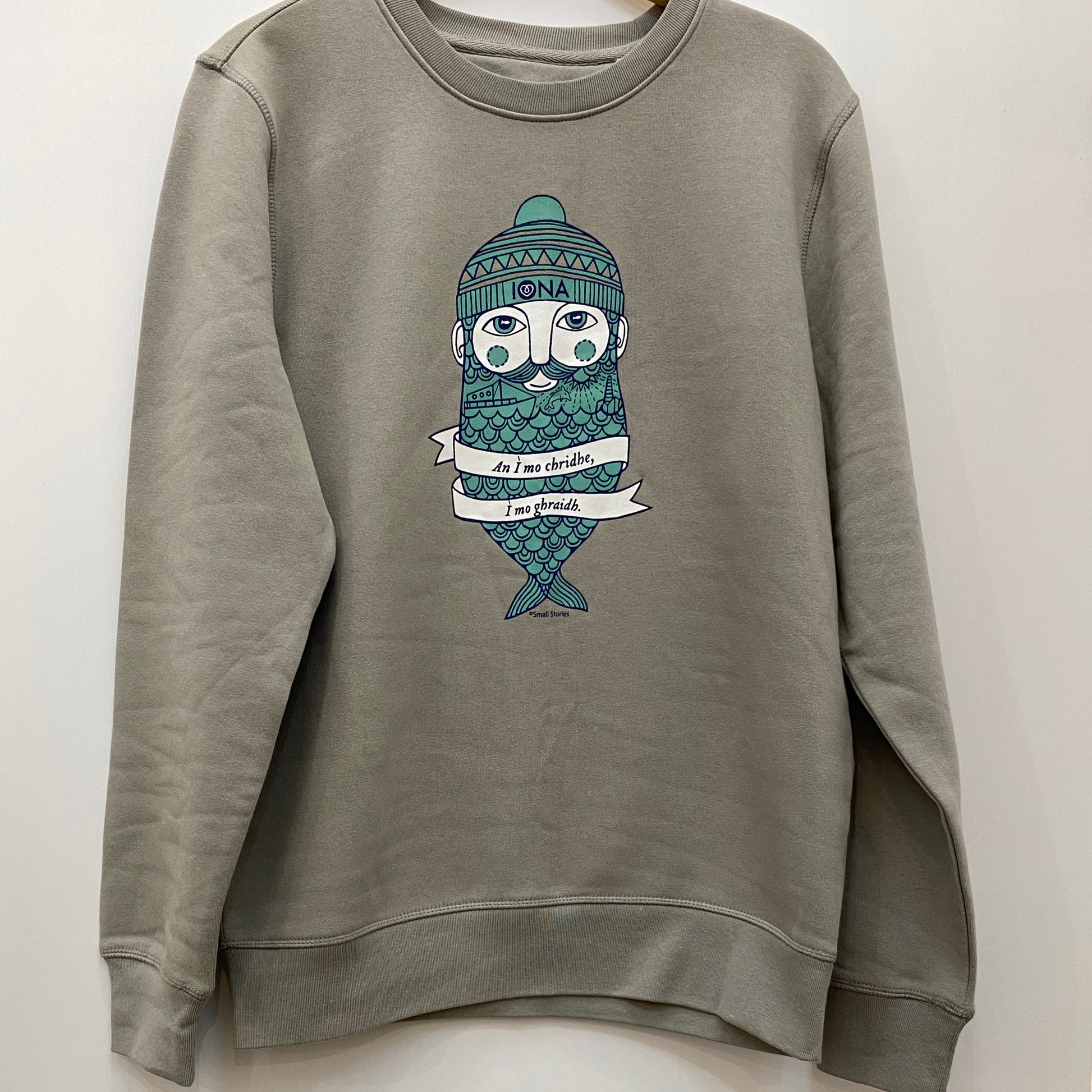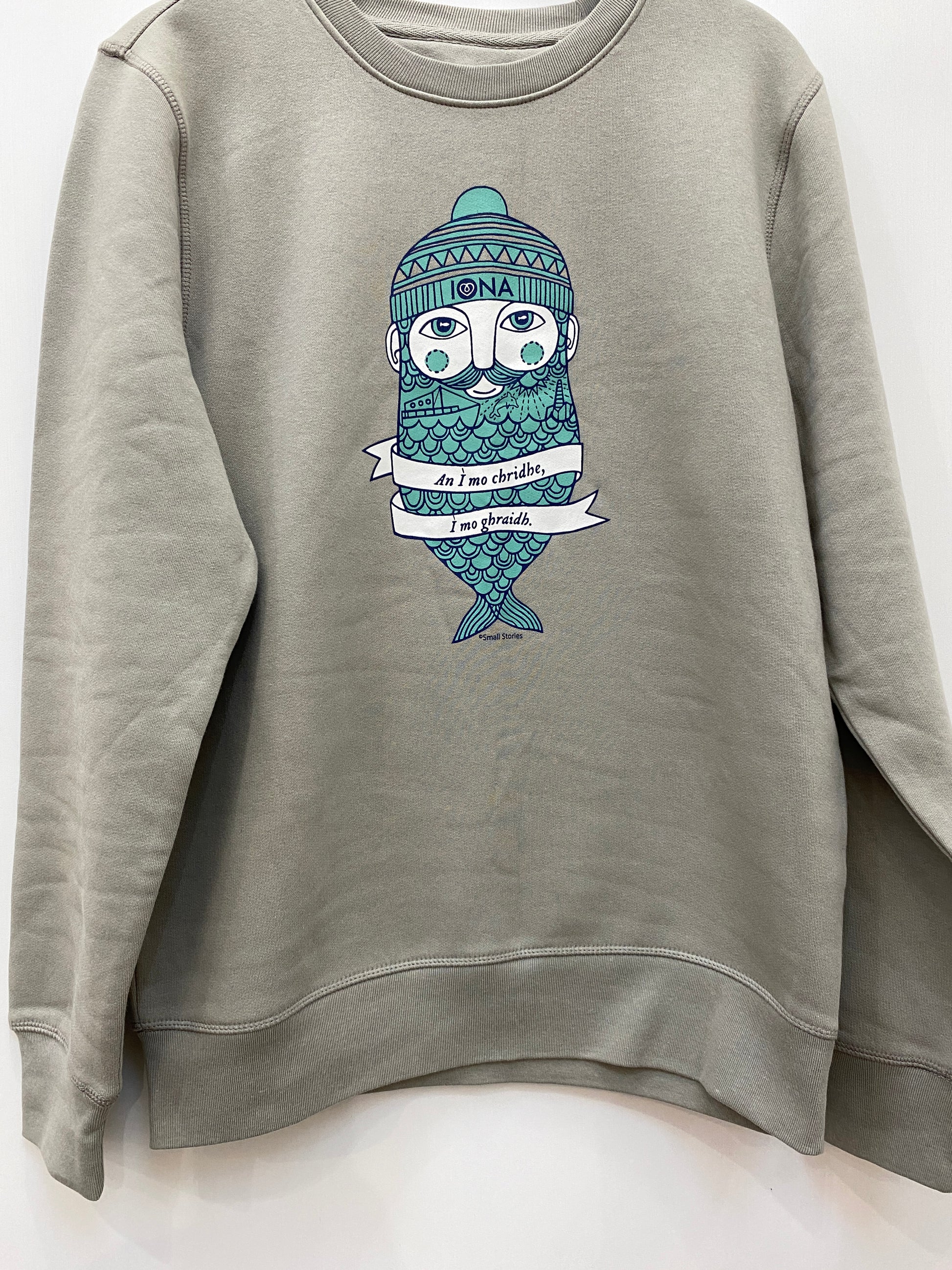 Comfortable crew-neck sweatshirt featuring artwork from our Iona Fishfolk range designed by friend of Iona Craft Shop, Small Stories and screen Printed in Glasgow.