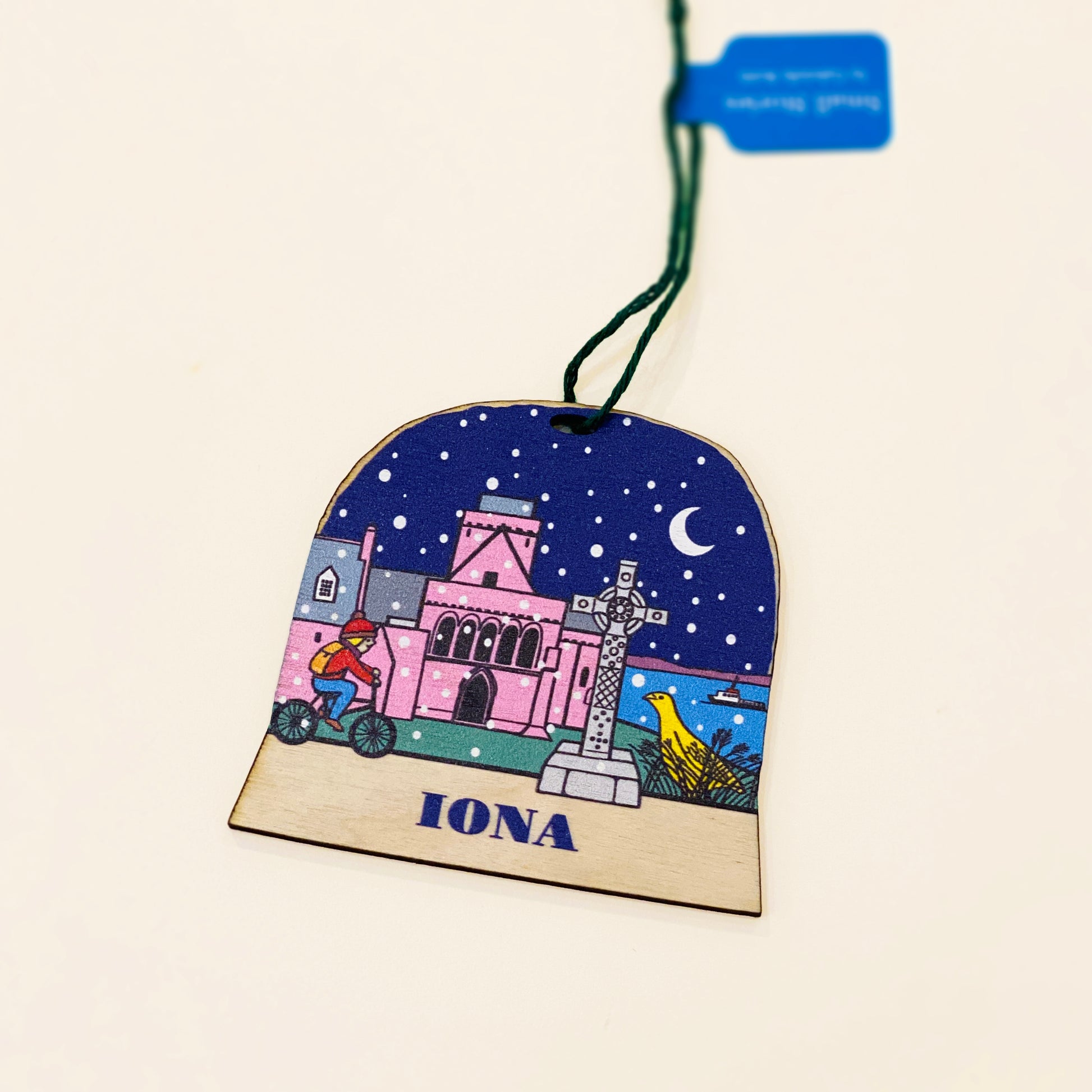 This Isle of Iona snow globe decoration is printed on wood from an original illustration by Small Stories.