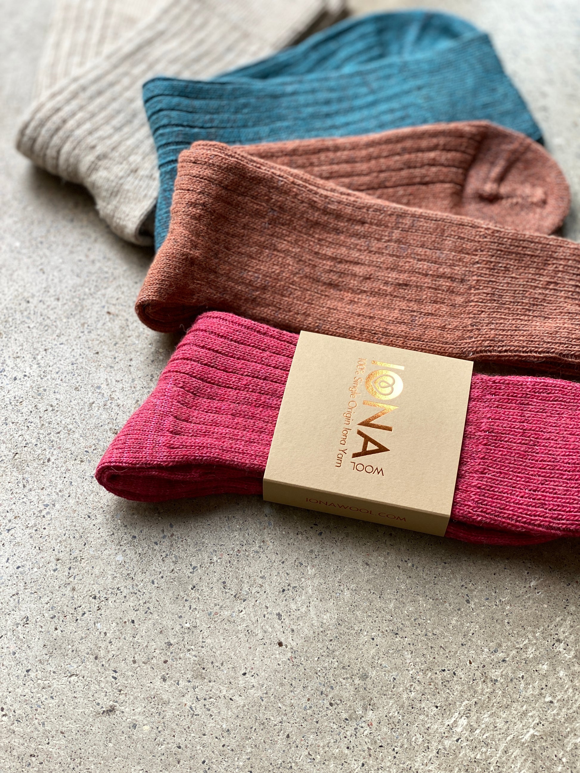 The second generation of Iona Wool Socks are closer fitting than the original and have a lightly elasticised top. Although still substantial, they can be worn comfortably beneath shoes or boots to bring warmth and assurance to every step.