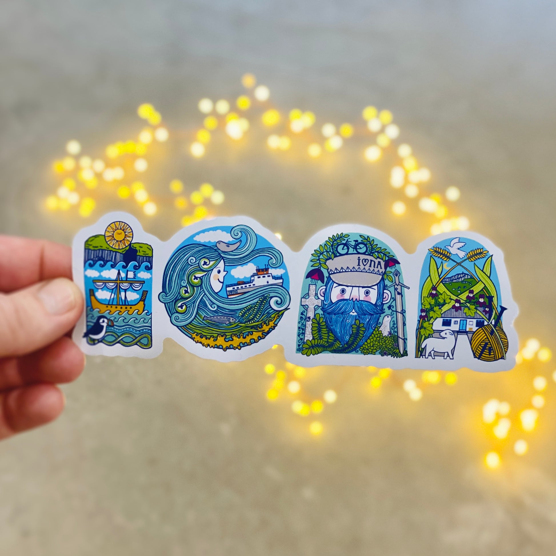 Fun vinyl sticker featuring an original illustration celebrating different elements of Iona.
