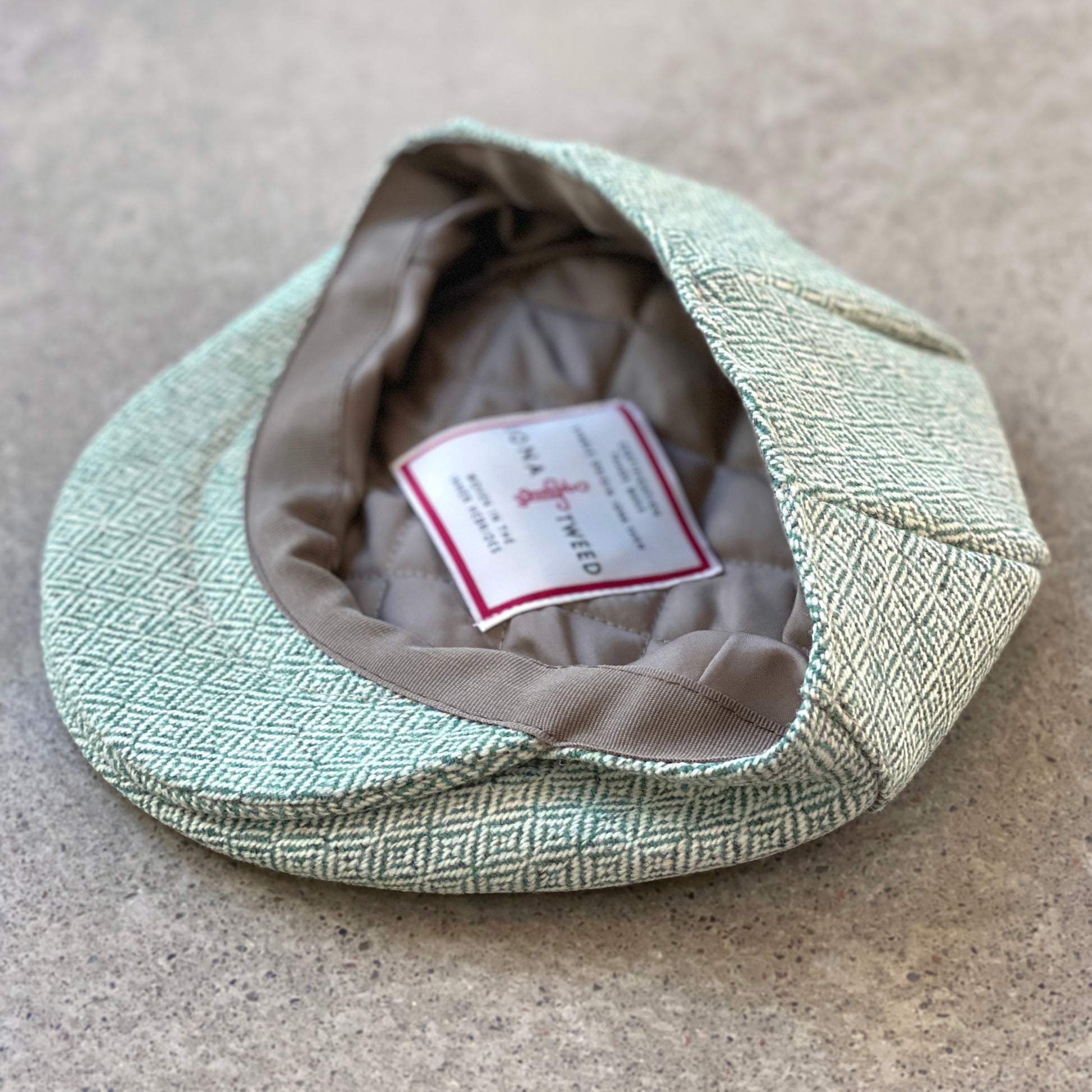 It has a classic stiffened peak and a warm silky lining with the Iona Tweed label of authentication sewn into the crown, and is available in different tweeds. You can read more about our Iona Tweed here.