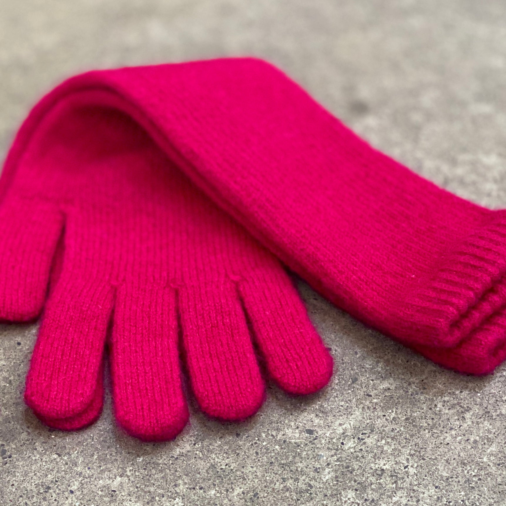 100% pure new wool. These soft and warm gloves can be worn almost to the elbow or gathered at the wrist.