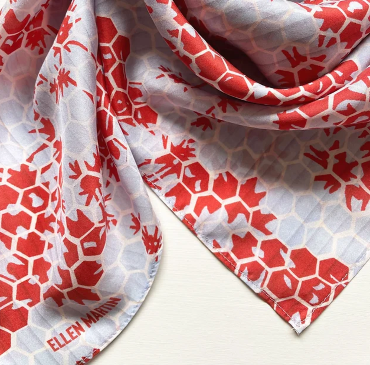 The Kyoto silk scarf designed by Ellen Martin has been digitally printed with a striking repeat pattern in red and pale blue. The design was developed from an original collage inspired by plants casting shadows on the streets of Kyoto.