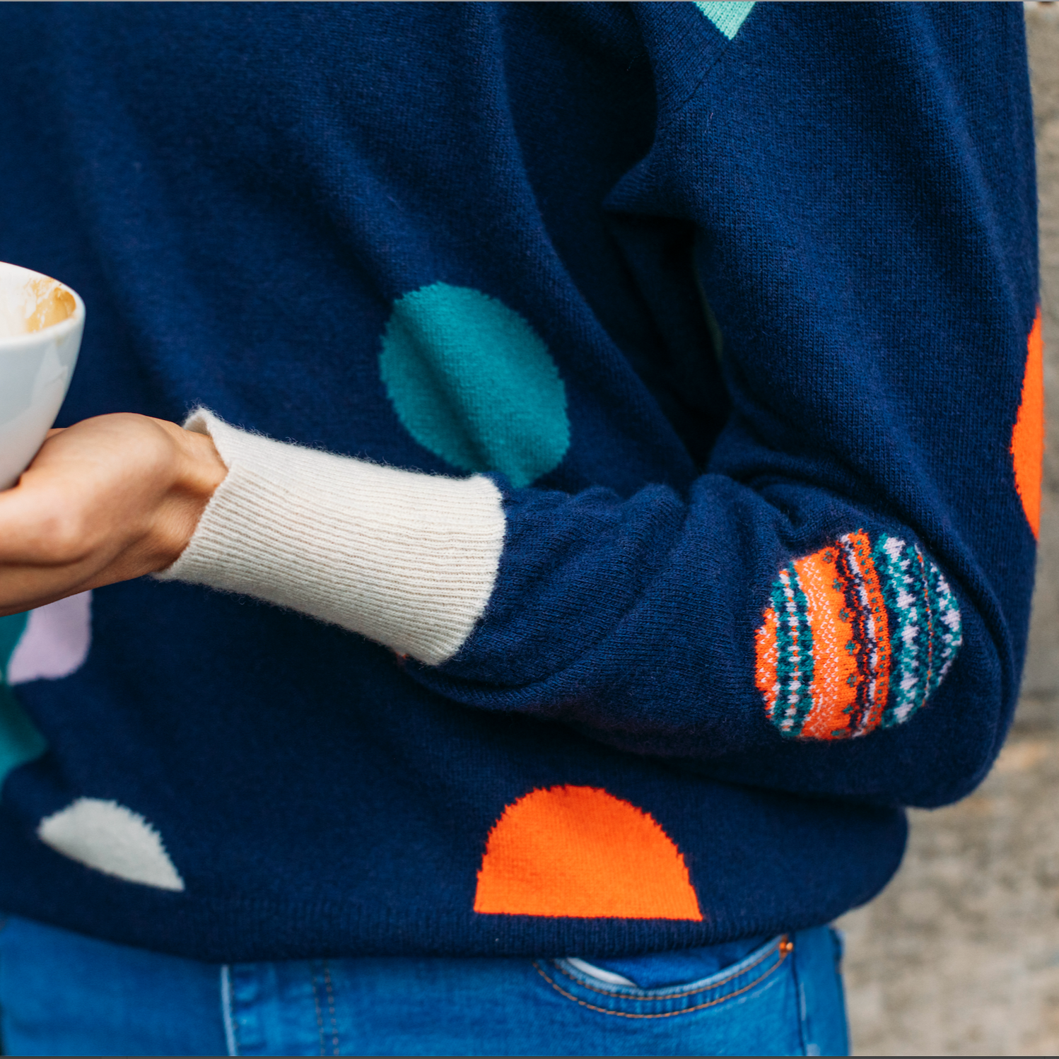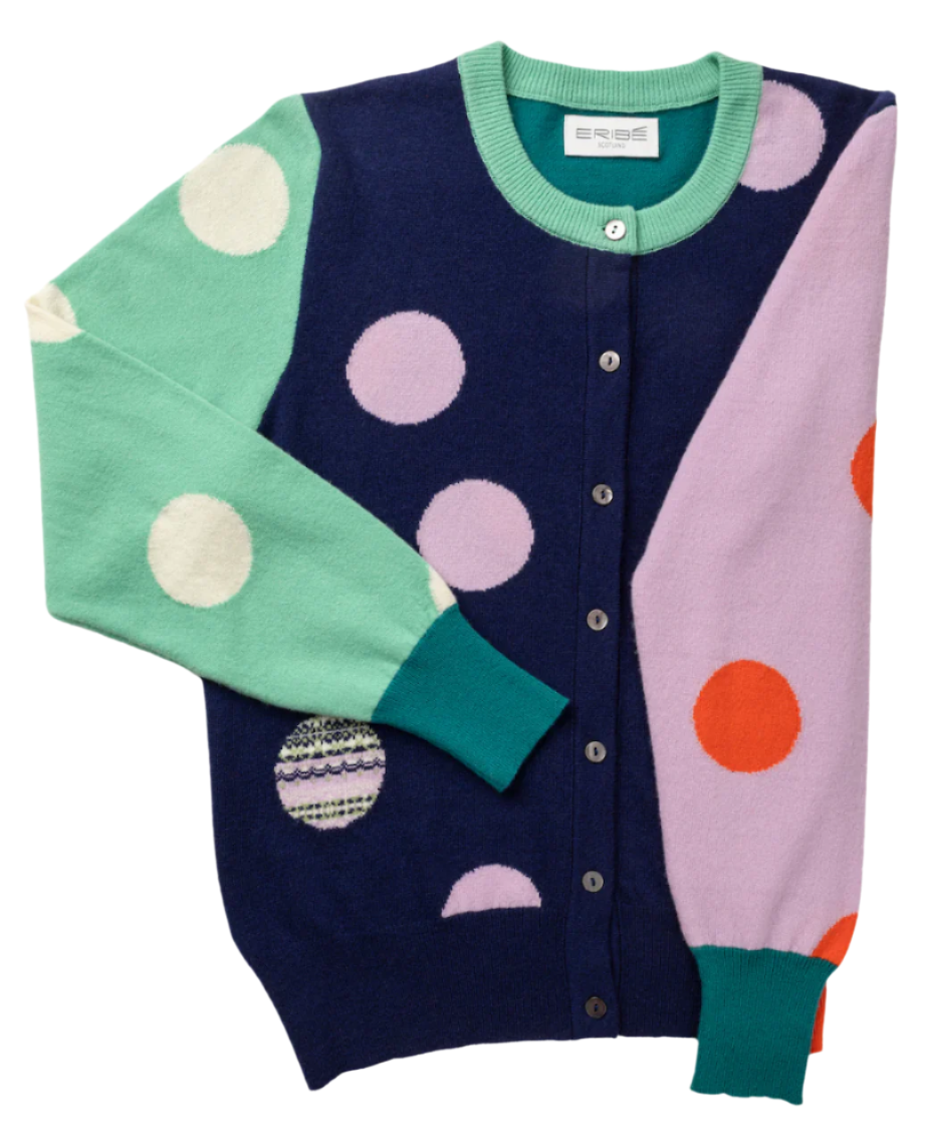 A lightweight, soft merino wool, long sleeve, round neck cardigan with pearl buttons in block colour and intarsia circle pattern. The cuffs are in a statement colour and easy to turn back.