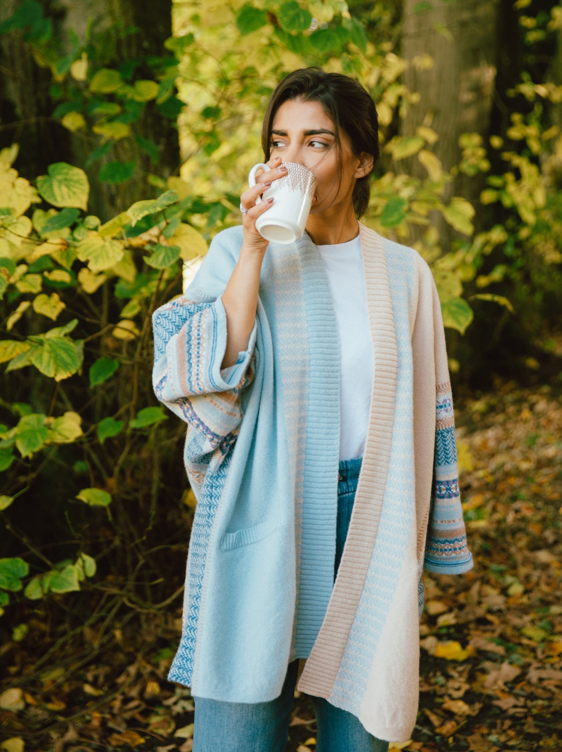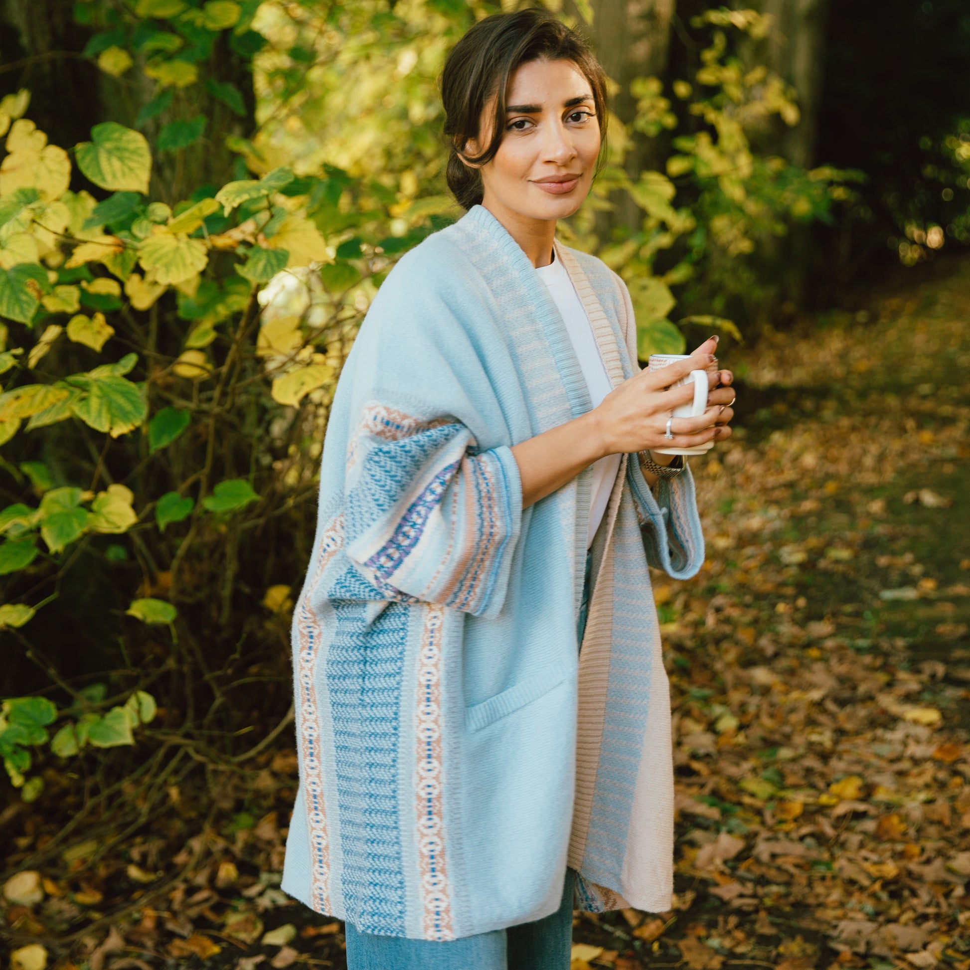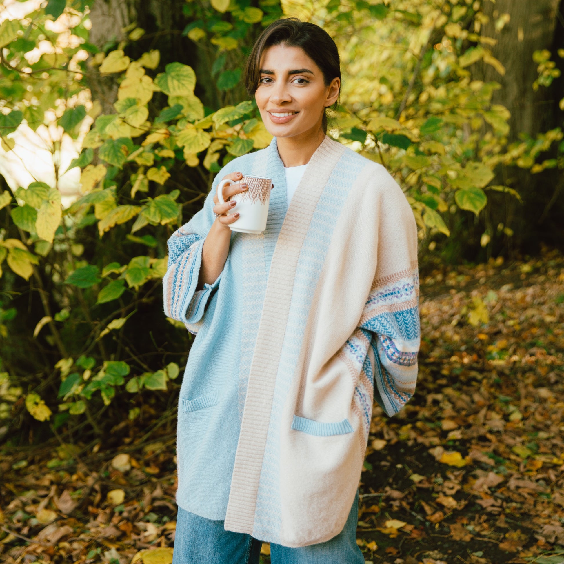 A versatile mid-thigh length coat, jacket or throw on, with practical deep pockets. Turn upside down for extra warmth around the shoulder or to wear elegantly as a shrug with a dress. A wonderful live-in garment for all occasions.