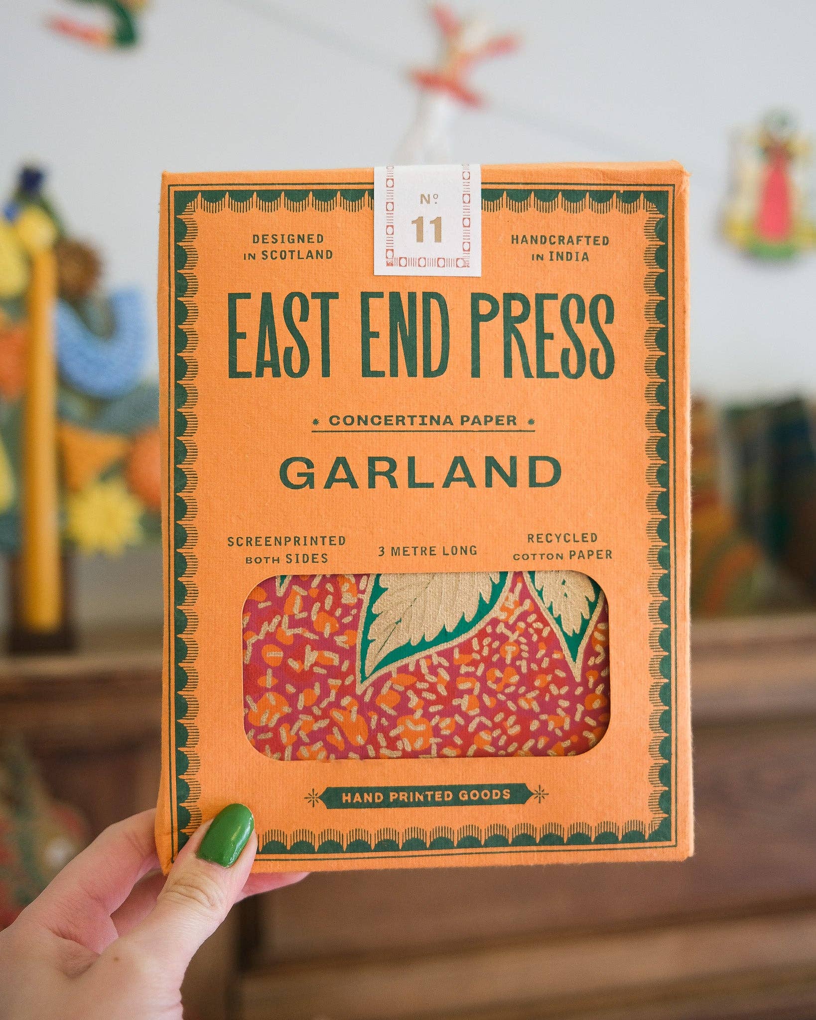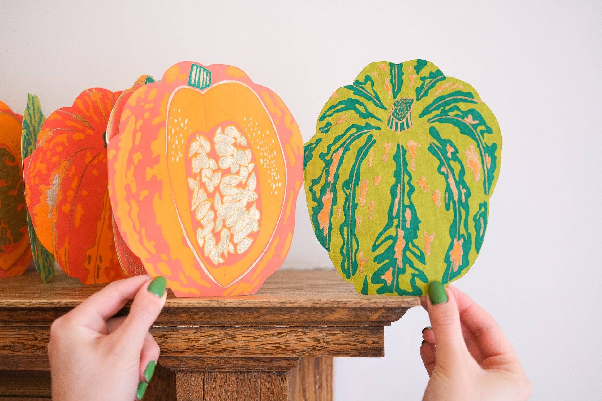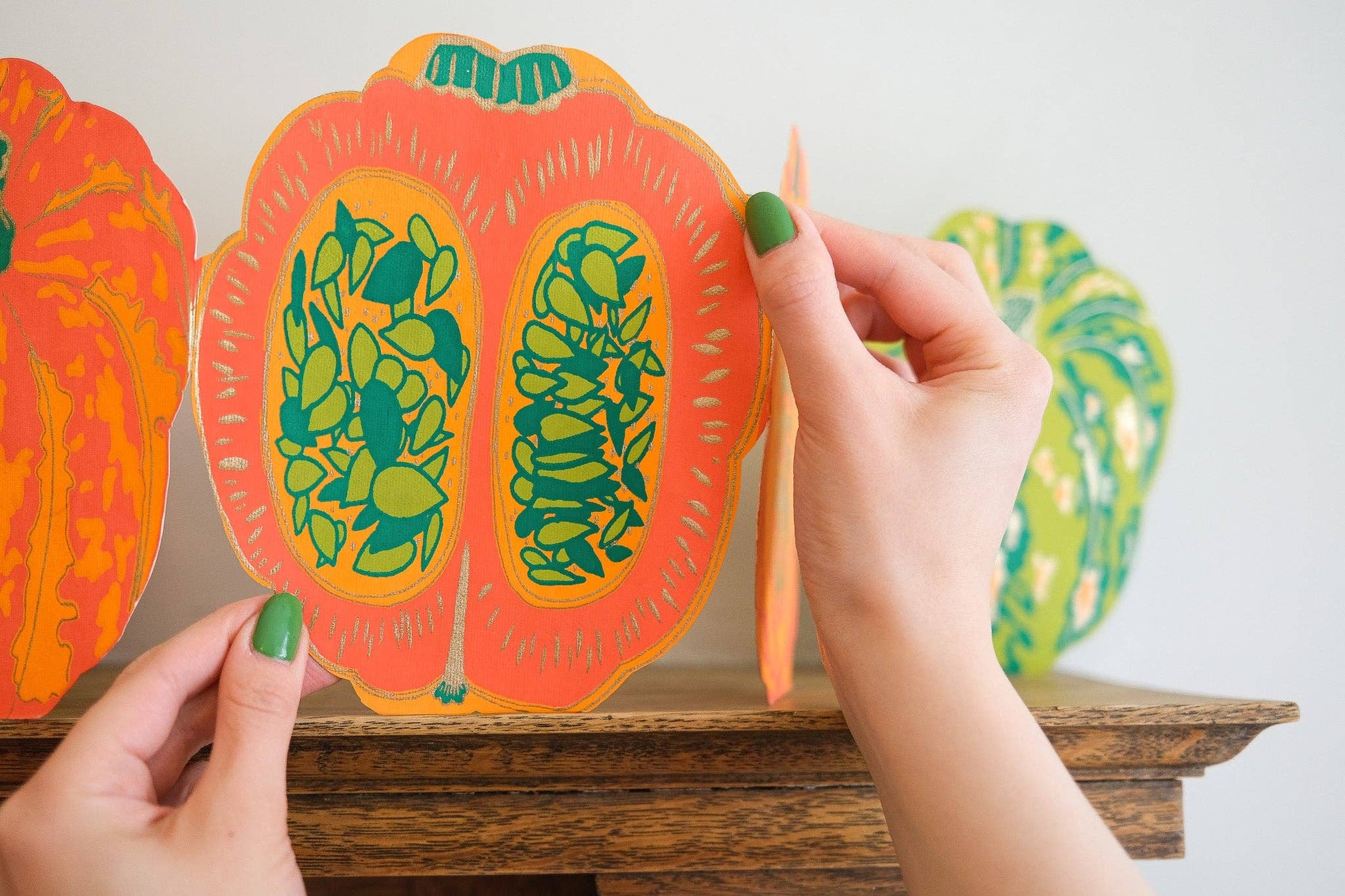 A concertina folded paper garland featuring squashes, gourds and pumpkins, perfect for Autumn time! This garland is hand printed on both sides, and made from thick handmade paper created from entirely recycled content.