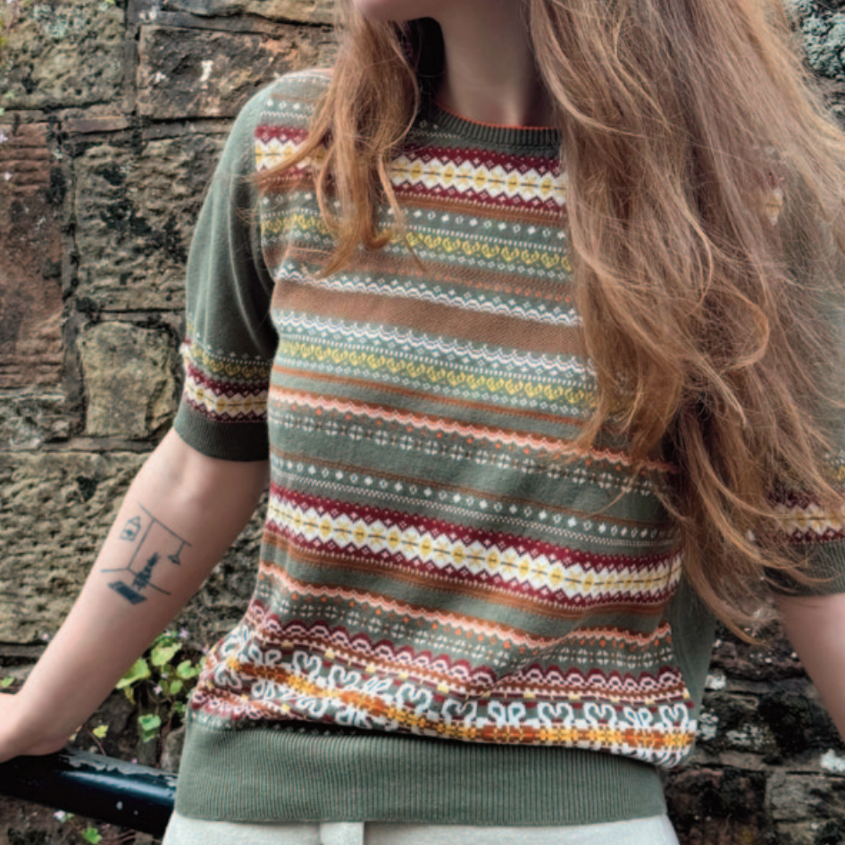 A light weight, short sleeve top knitted in 100% organic cotton. The traditional fairisle pattern is interrupted with small tweed patterns on the front and above the cuffs only. The back is plain with a striking contrast colour on the rib and inside the neck only. This makes a classic design unique and fun to wear