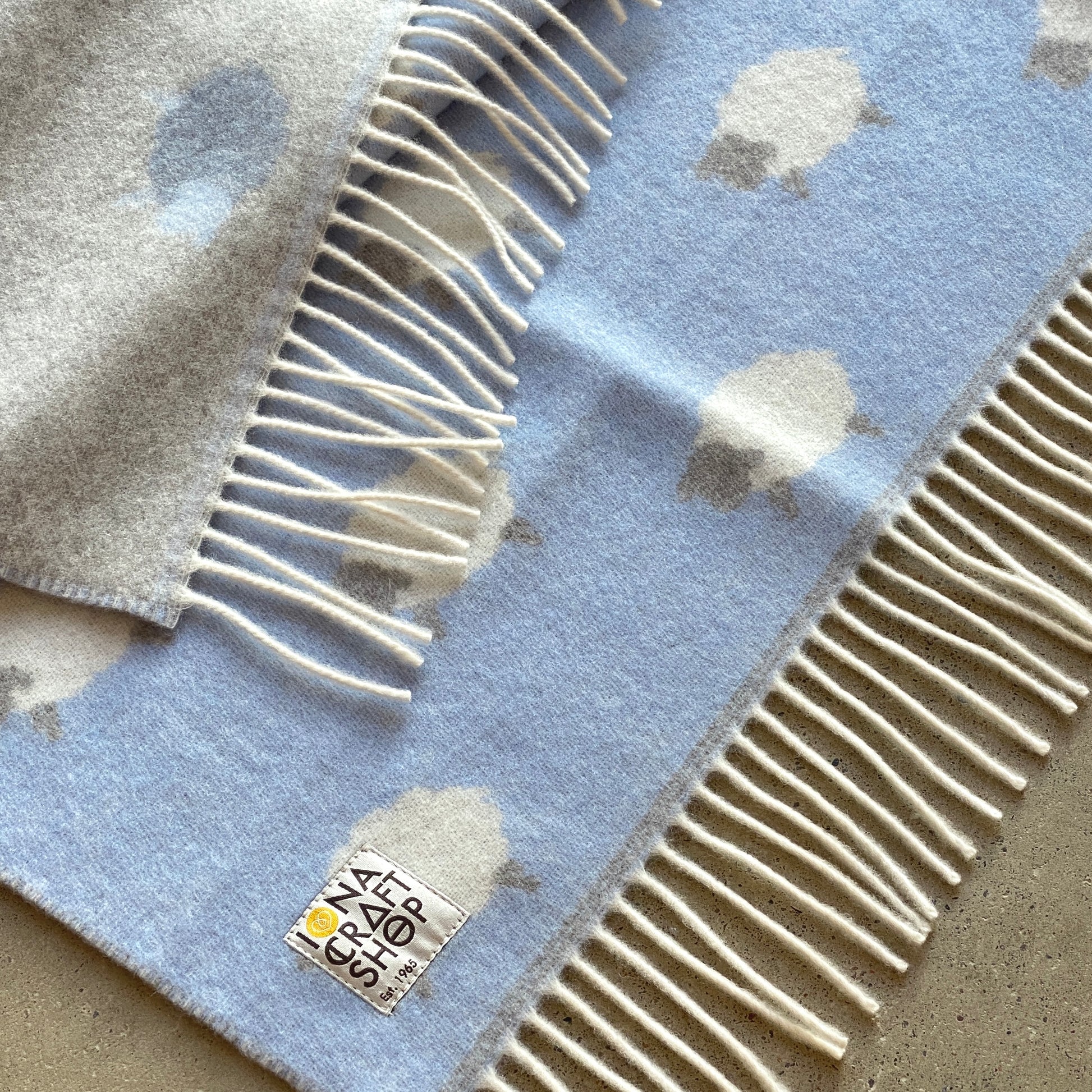 The intricate weave uses a soft blue and cream yarn to create a beautiful sheep design, finished with soft fringe tassles.