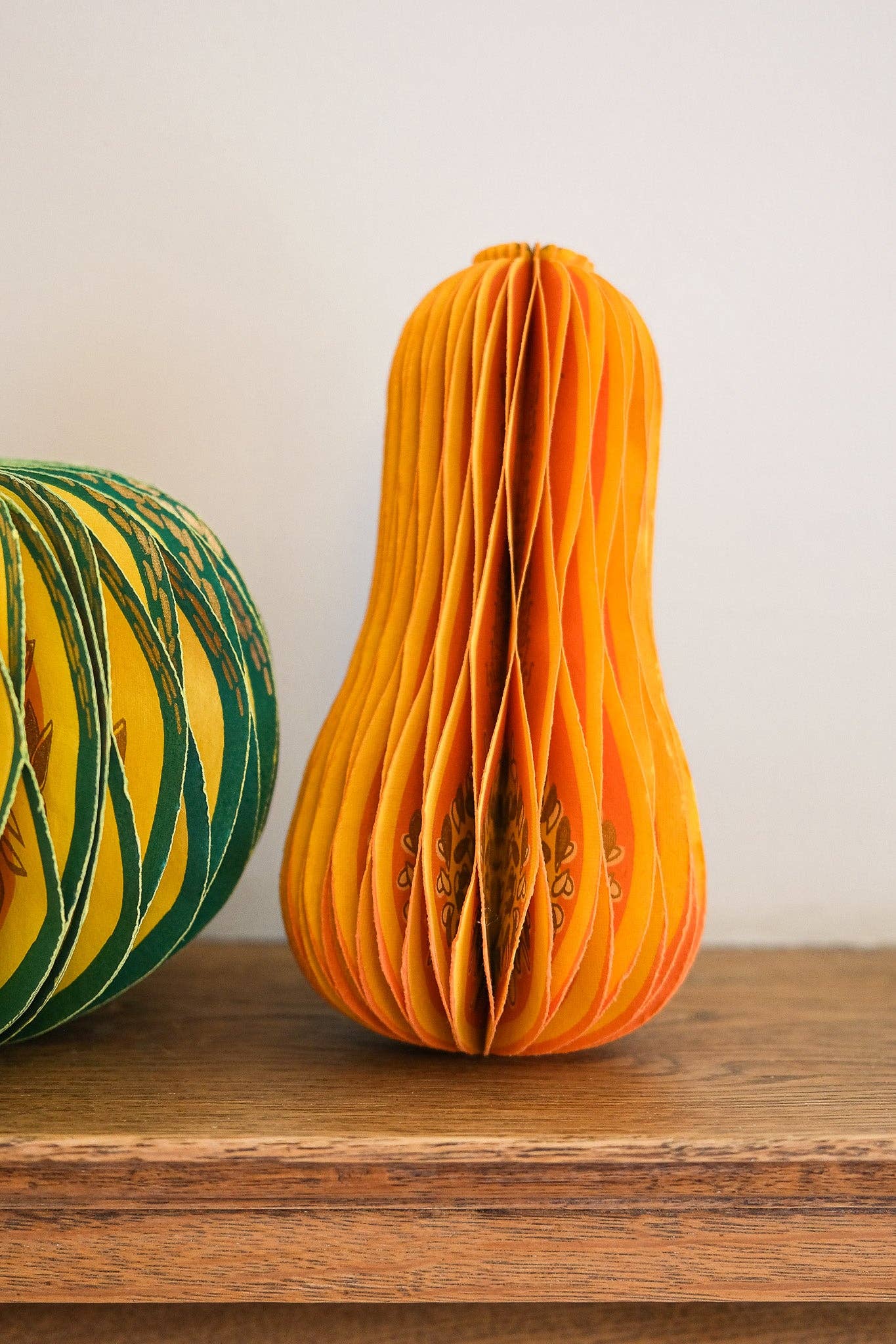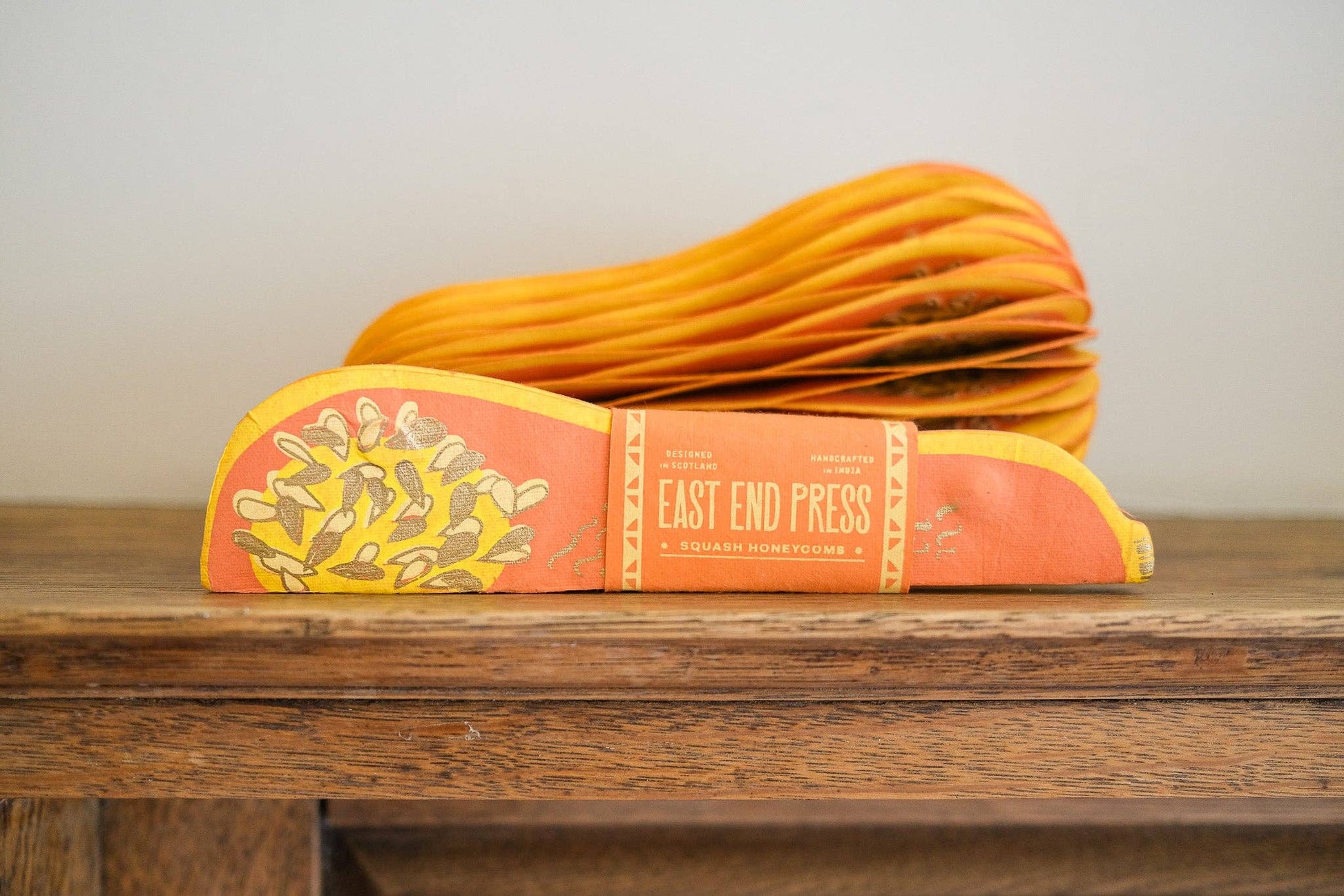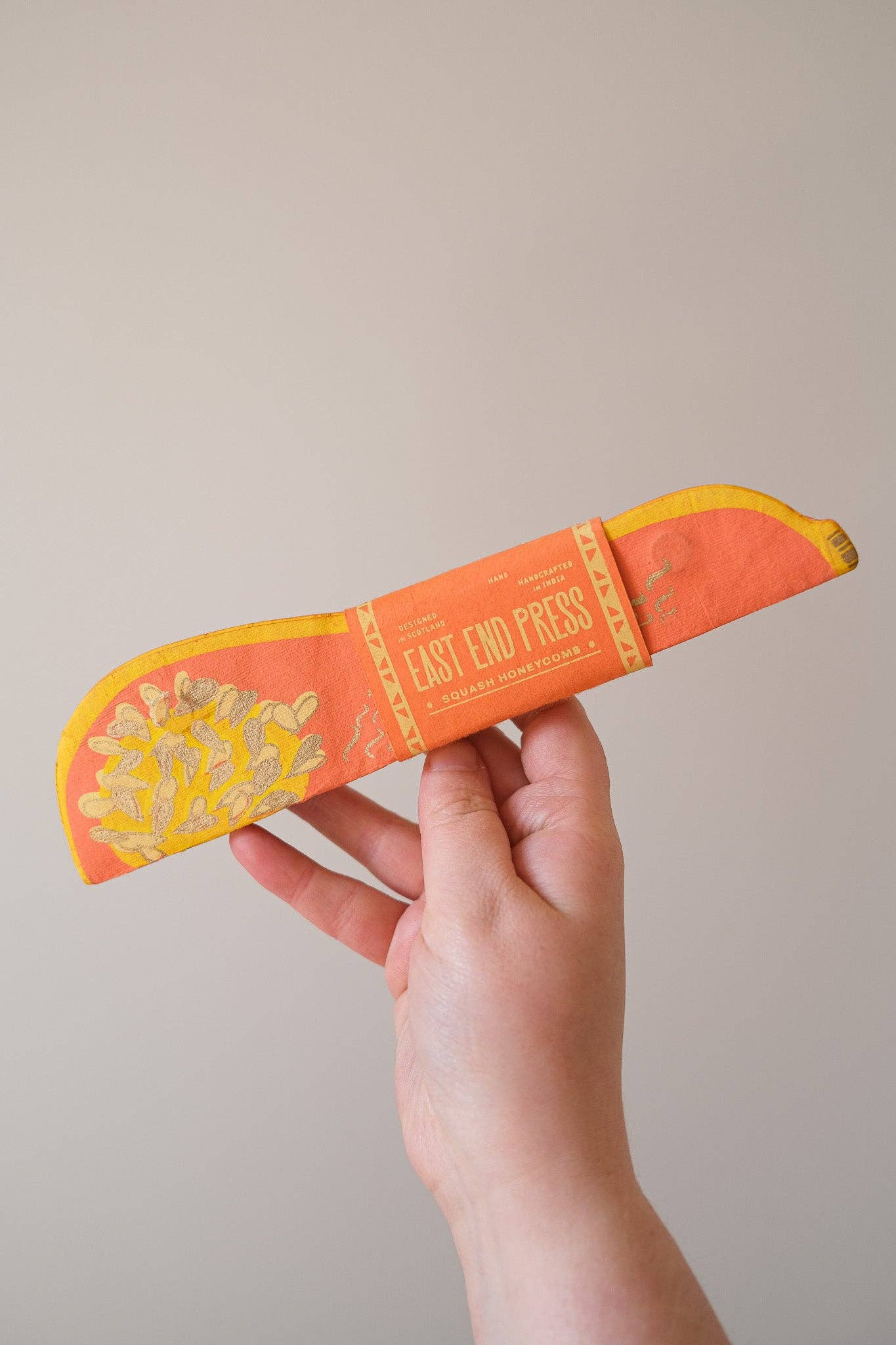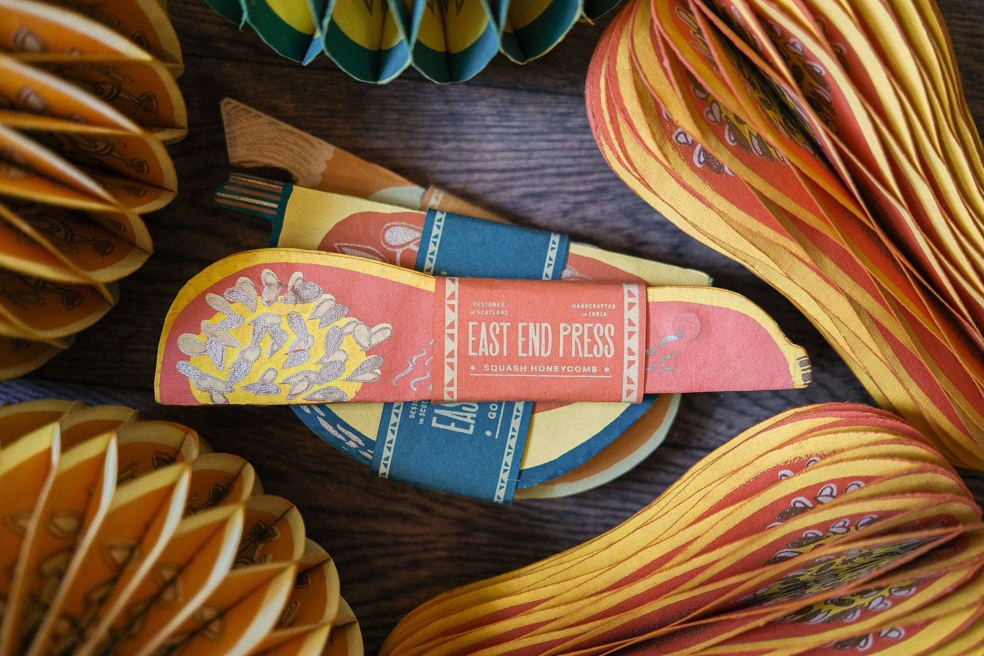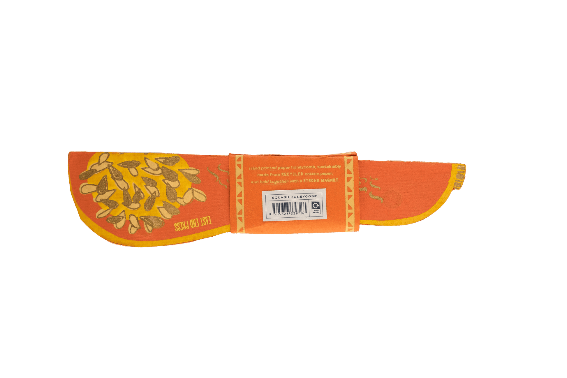 Composed of intricate layers of recycled cotton paper, each decoration unfolds and secured by a magnet to reveal a three-dimensional honeycomb squash.