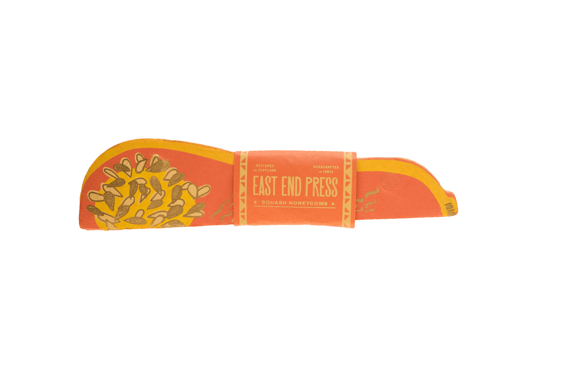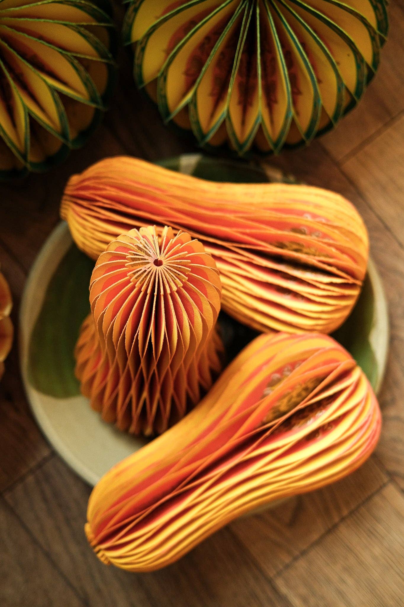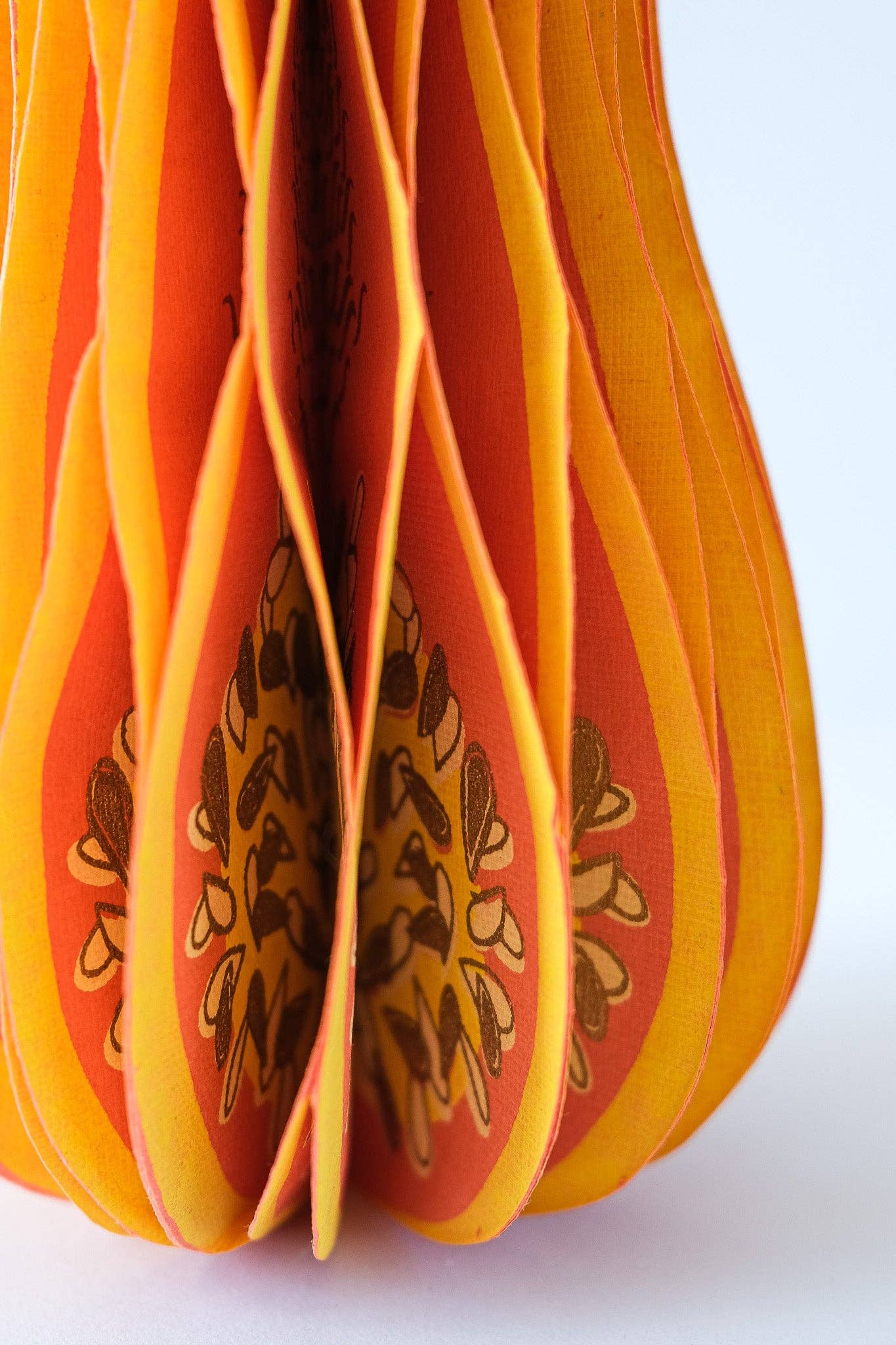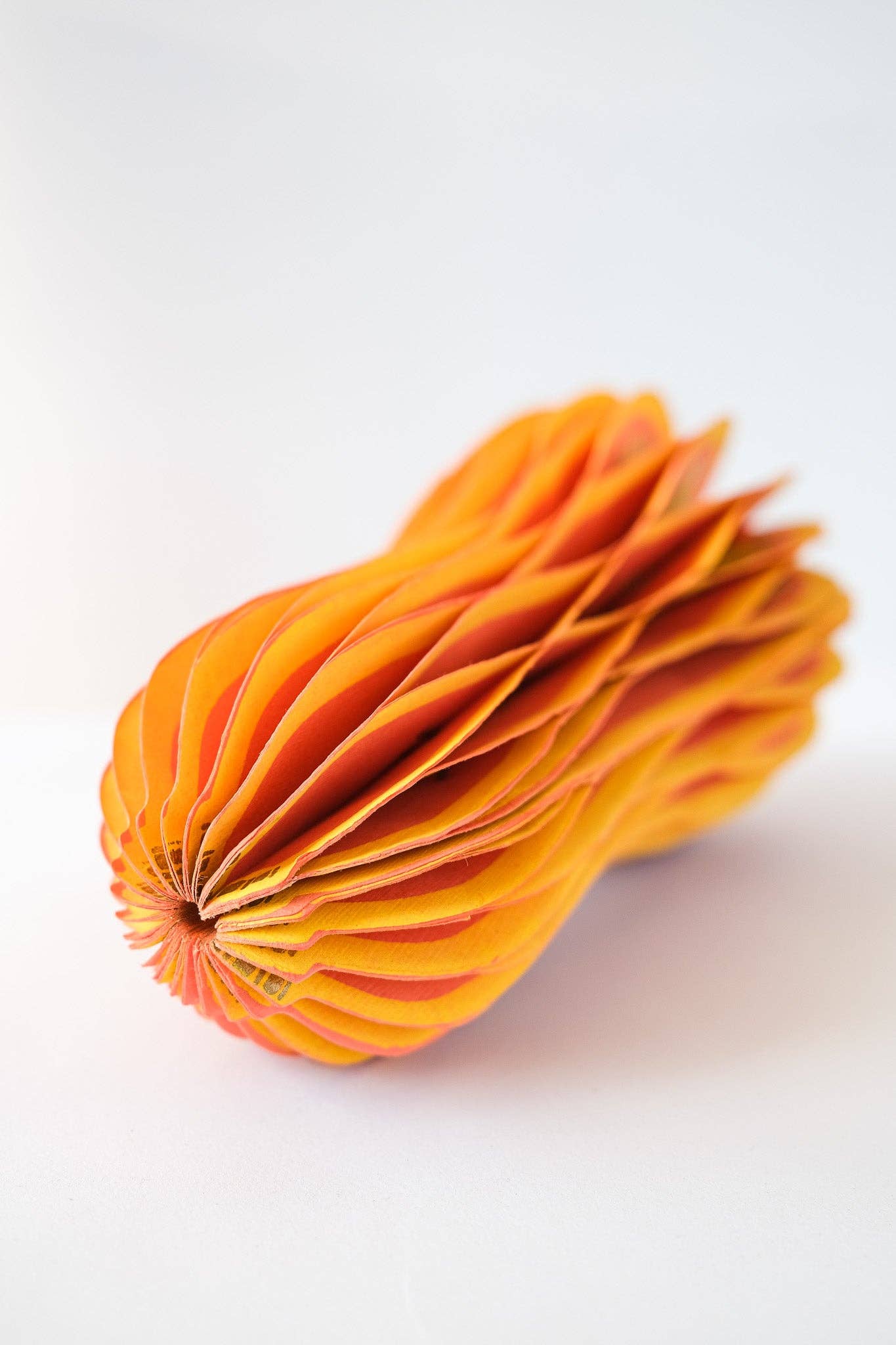 Composed of intricate layers of recycled cotton paper, each decoration unfolds and secured by a magnet to reveal a three-dimensional honeycomb squash.