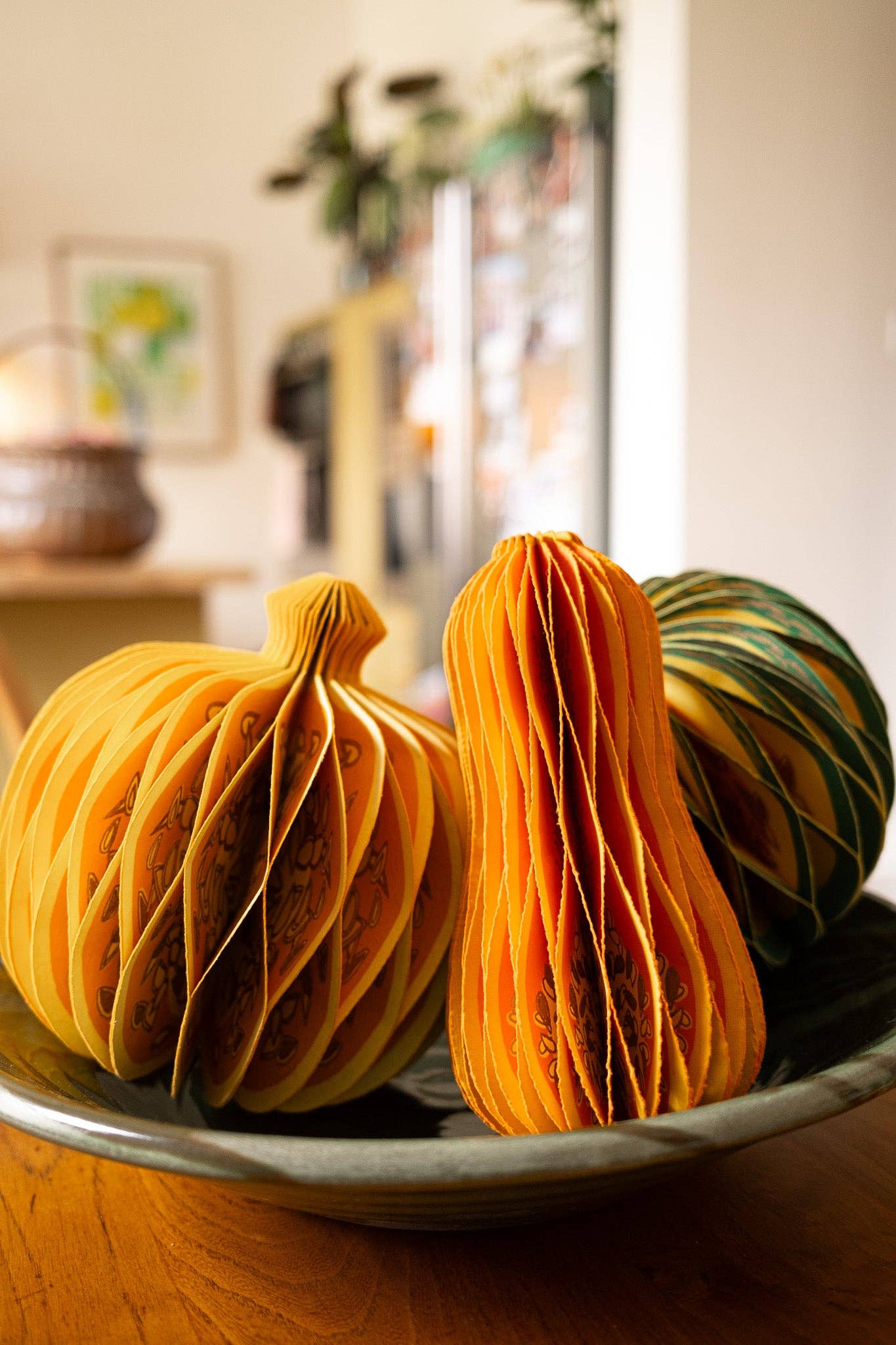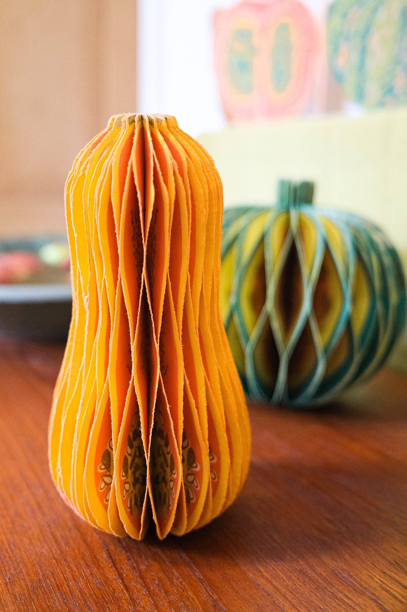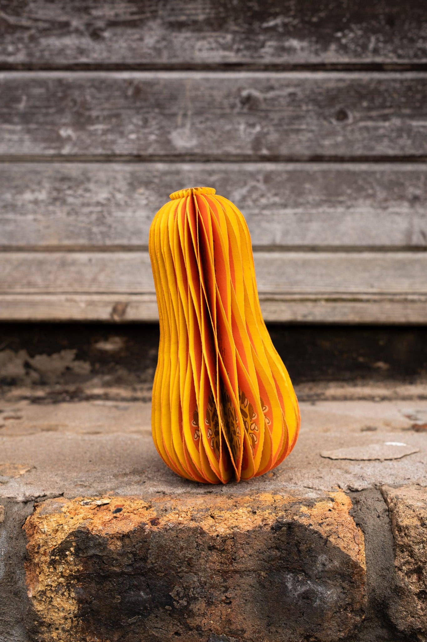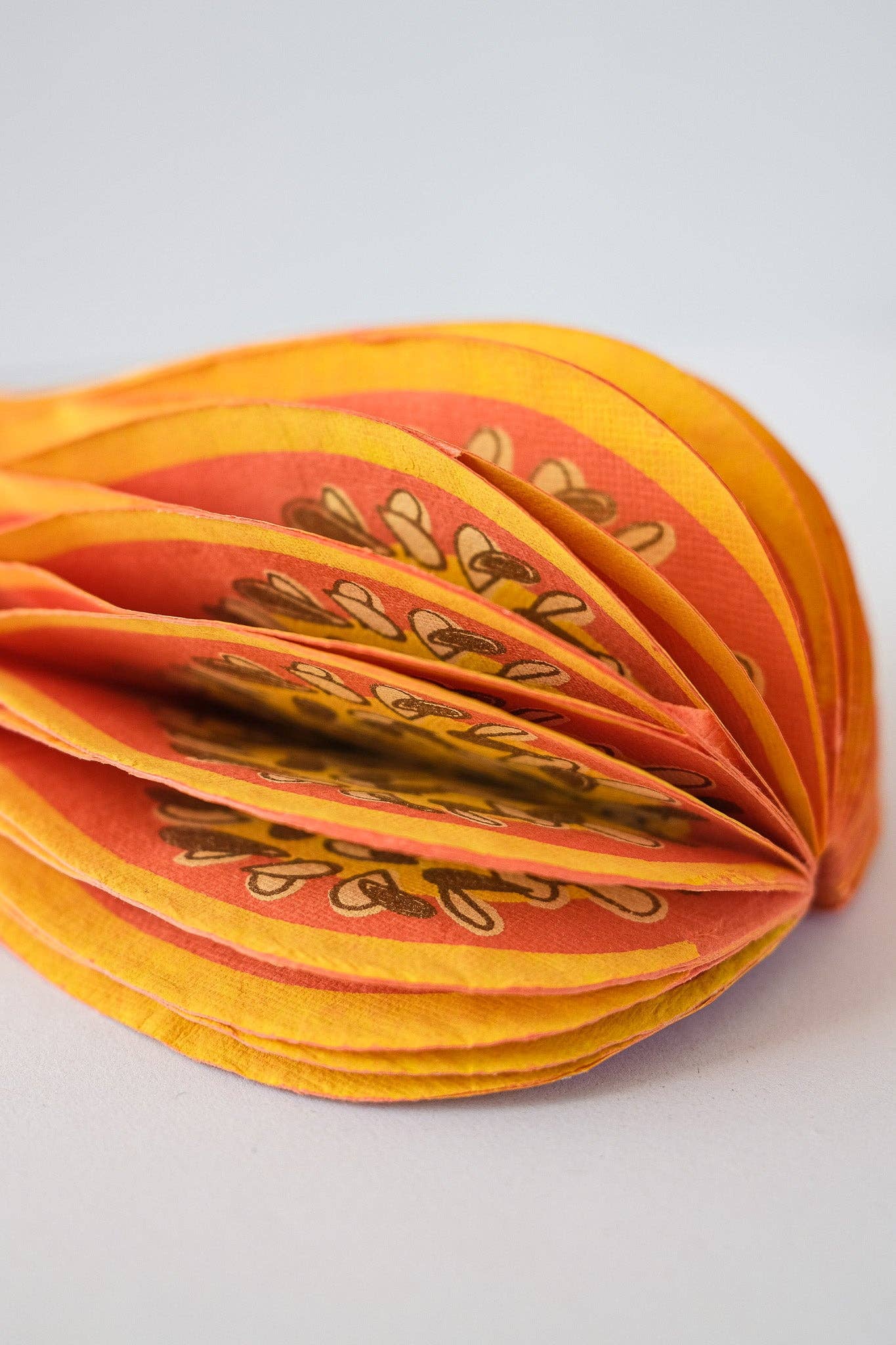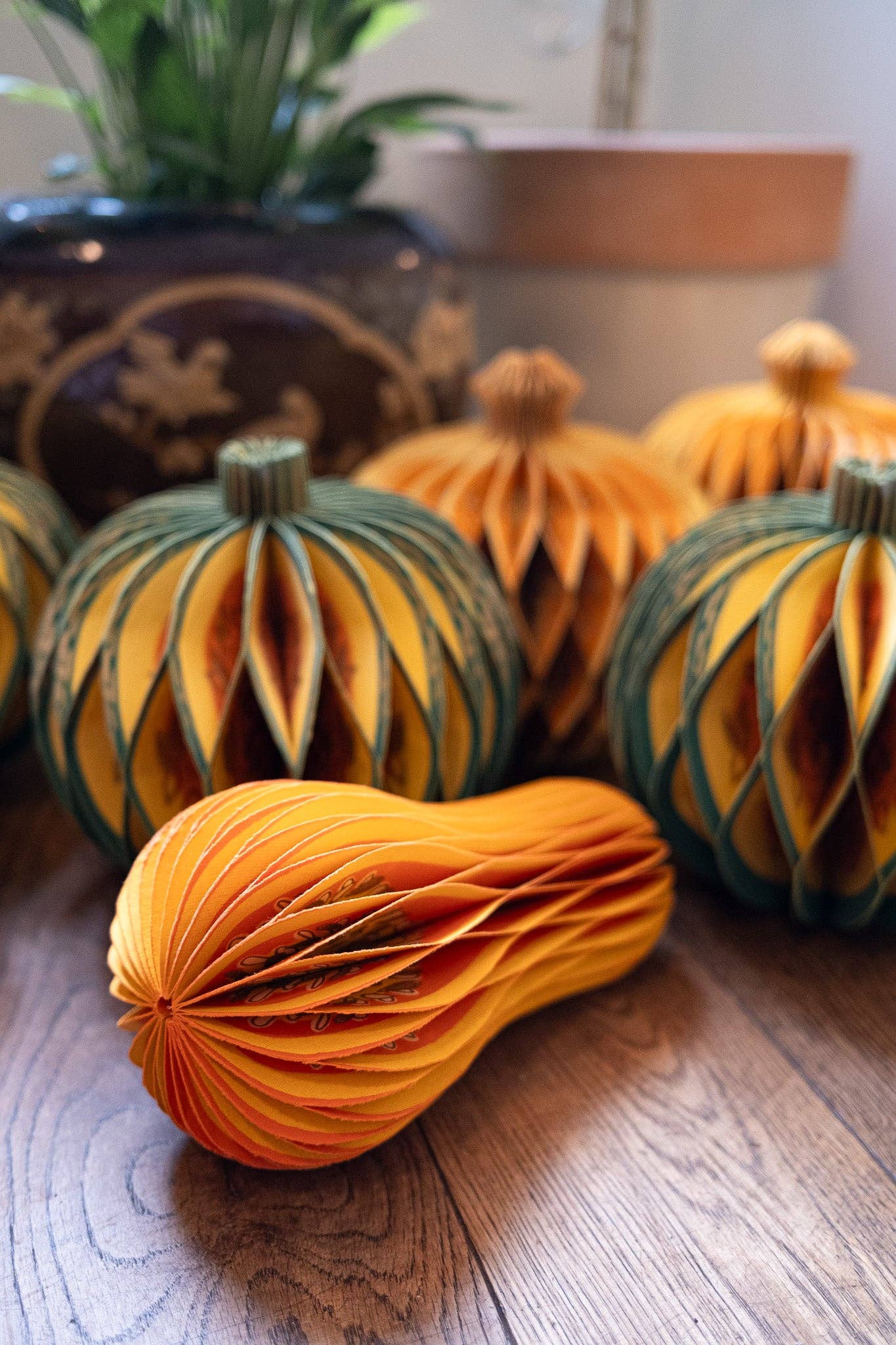 Composed of intricate layers of recycled cotton paper, each decoration unfolds and secured by a magnet to reveal a three-dimensional honeycomb squash.