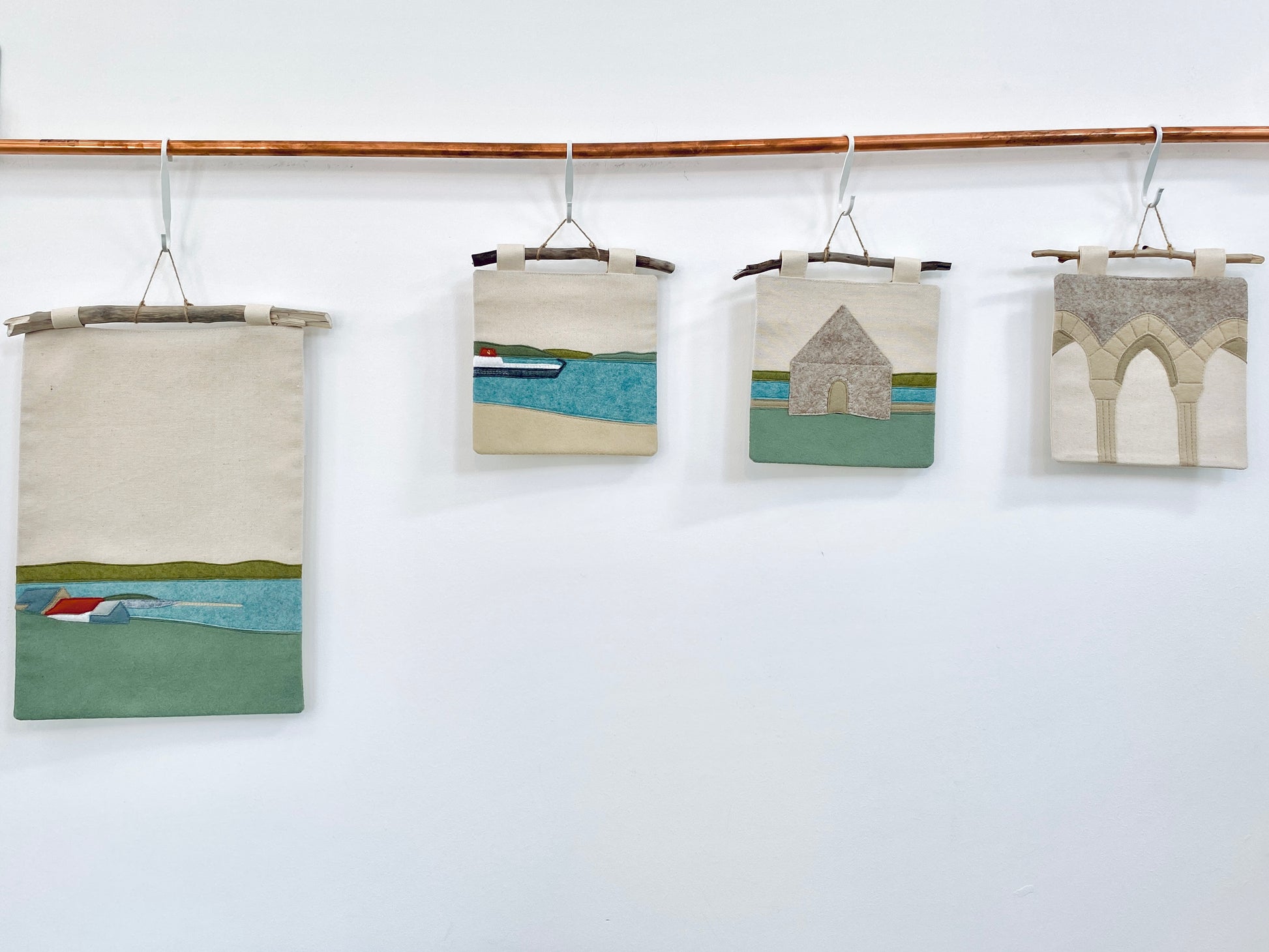 Using appliquéd felt in a minimalistic style with detailed stitching and a refined colour palette, Freya’s tapestries work both individually and as mini collections.