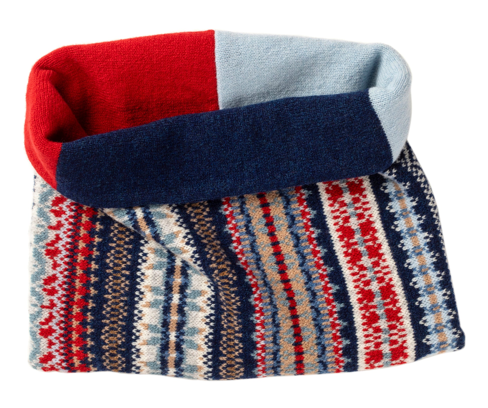 New for this seasons the Stobo snood is crafted using the softest Merino Lambswool with a signature Fairisle design on one side and a colour block design on the inside making these a unique, reversible accessory.