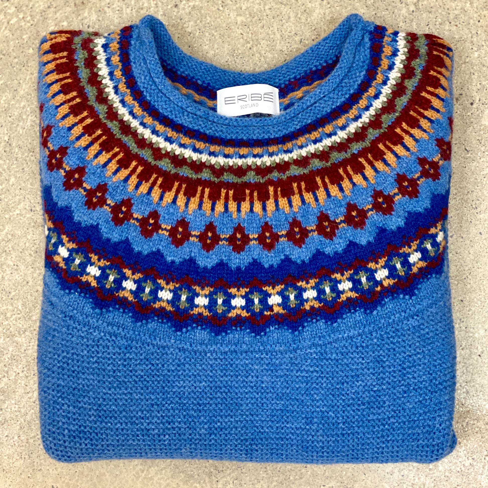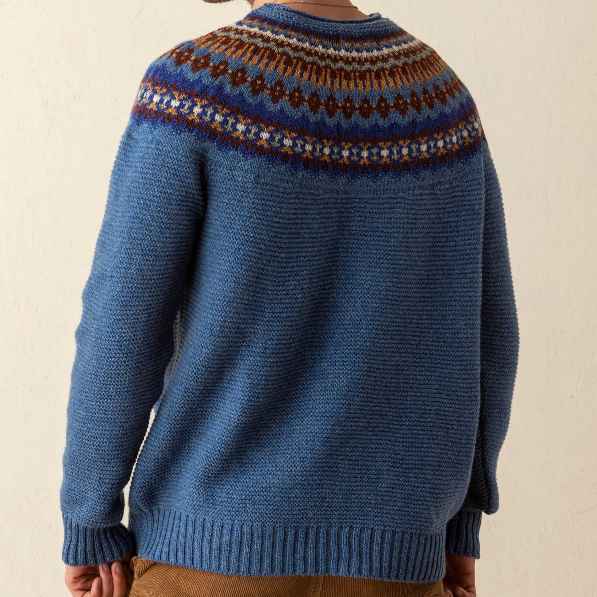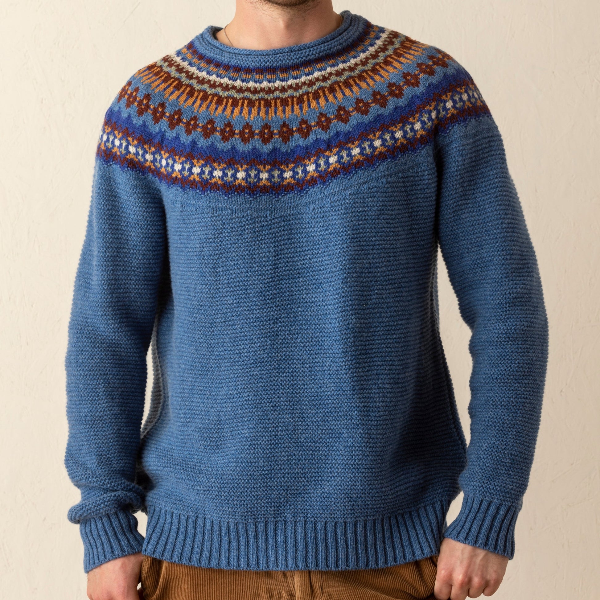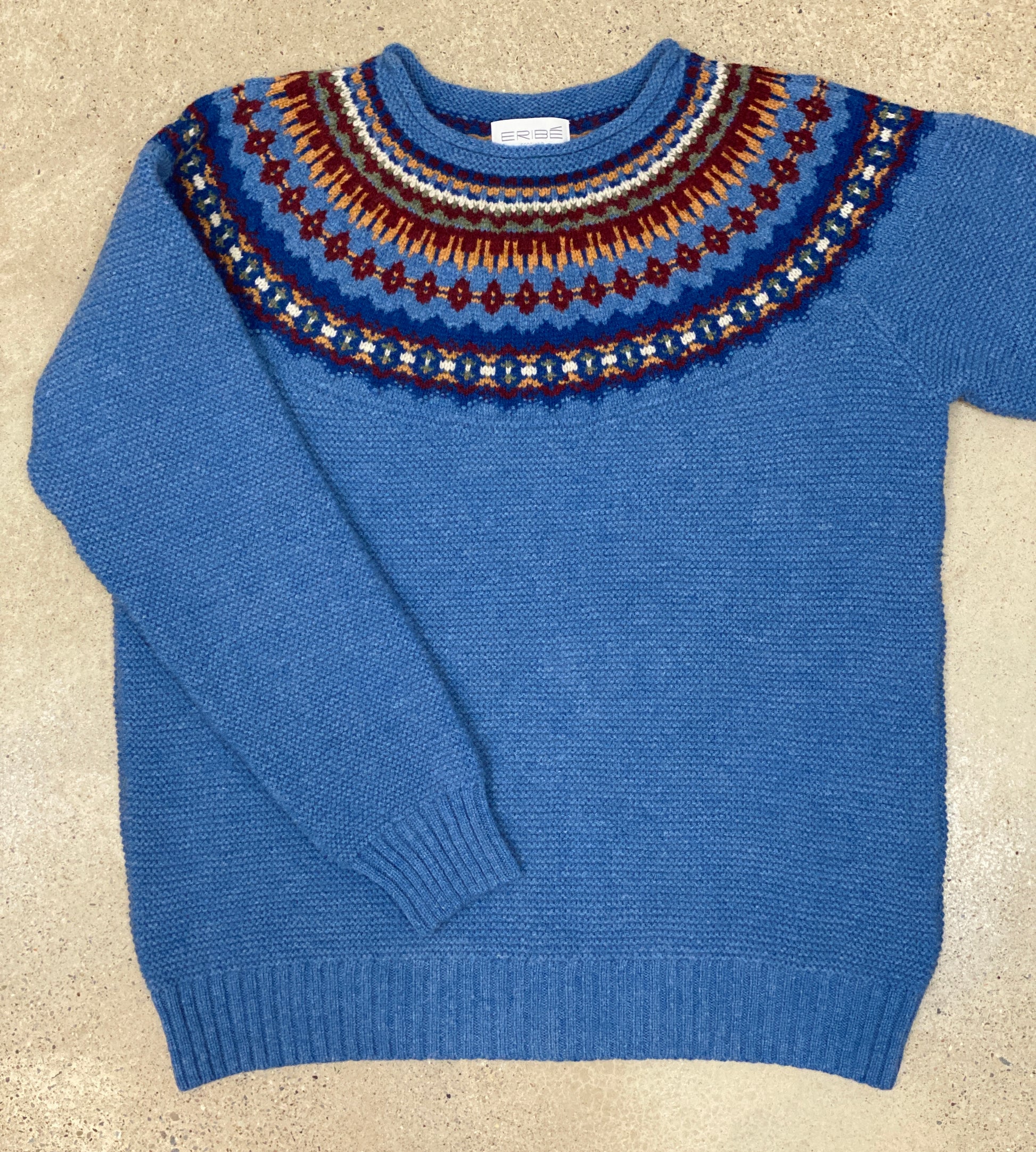 A supersoft textured knit with a distinctive graphic yoke around the neck and a loose fit.