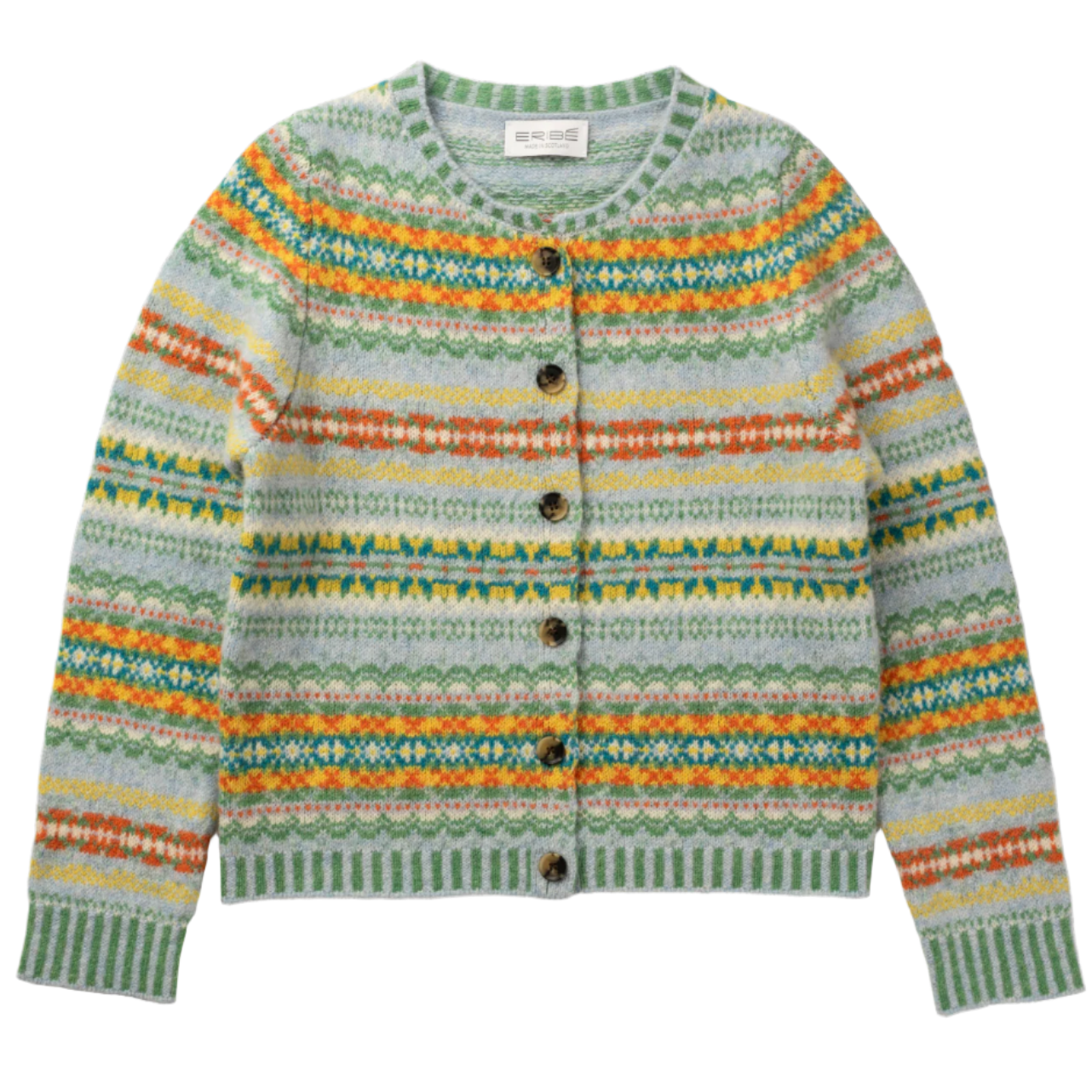 Densely patterned in designs taken from traditional Shetland and Fairisle knitting, the Westray Fairisle cardigan honours age-old skills whilst introducing a modern twist. The natural horn buttons reflect the overall theme of wild Scottish landscapes that inspires the colours and textures of this beautifully soft 100% Soft Shetland wool.