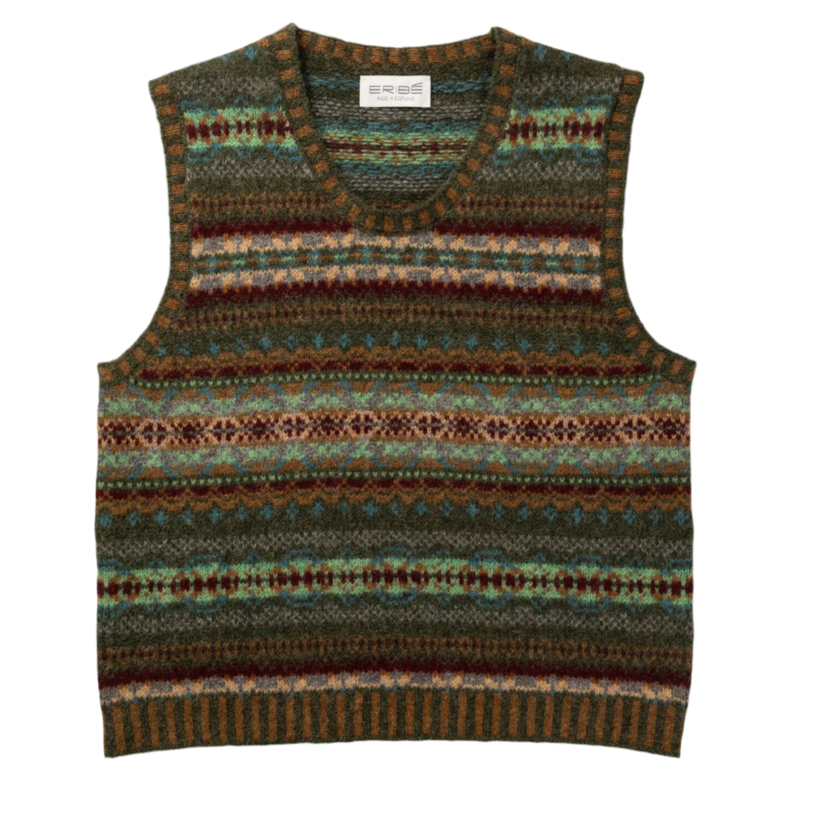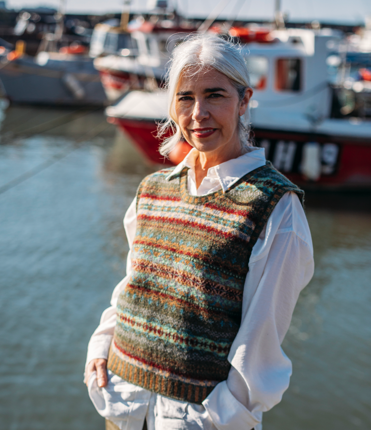 Densely patterned in designs taken from traditional Shetland and Fairisle knitting, the Westray Fairisle vest honours age-old skills whilst introducing a modern twist. 100% Shetland wool.