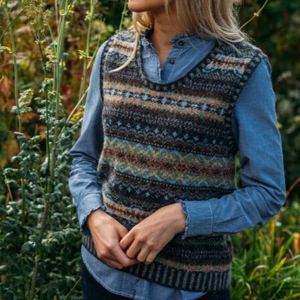 Densely patterned in designs taken from traditional Shetland and Fairisle knitting, the Westray Fairisle vest honours age-old skills whilst introducing a modern twist. 100% Shetland wool.